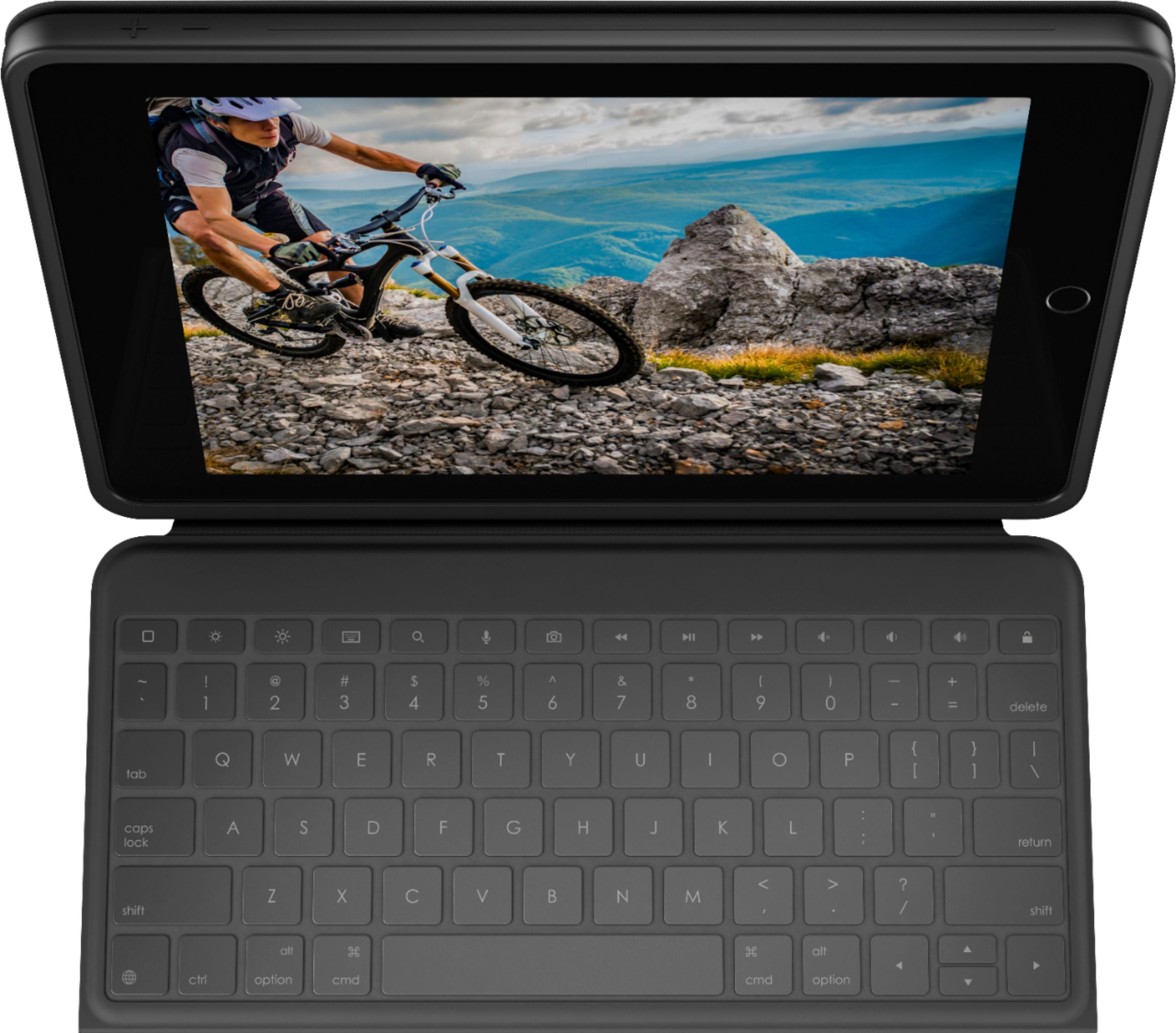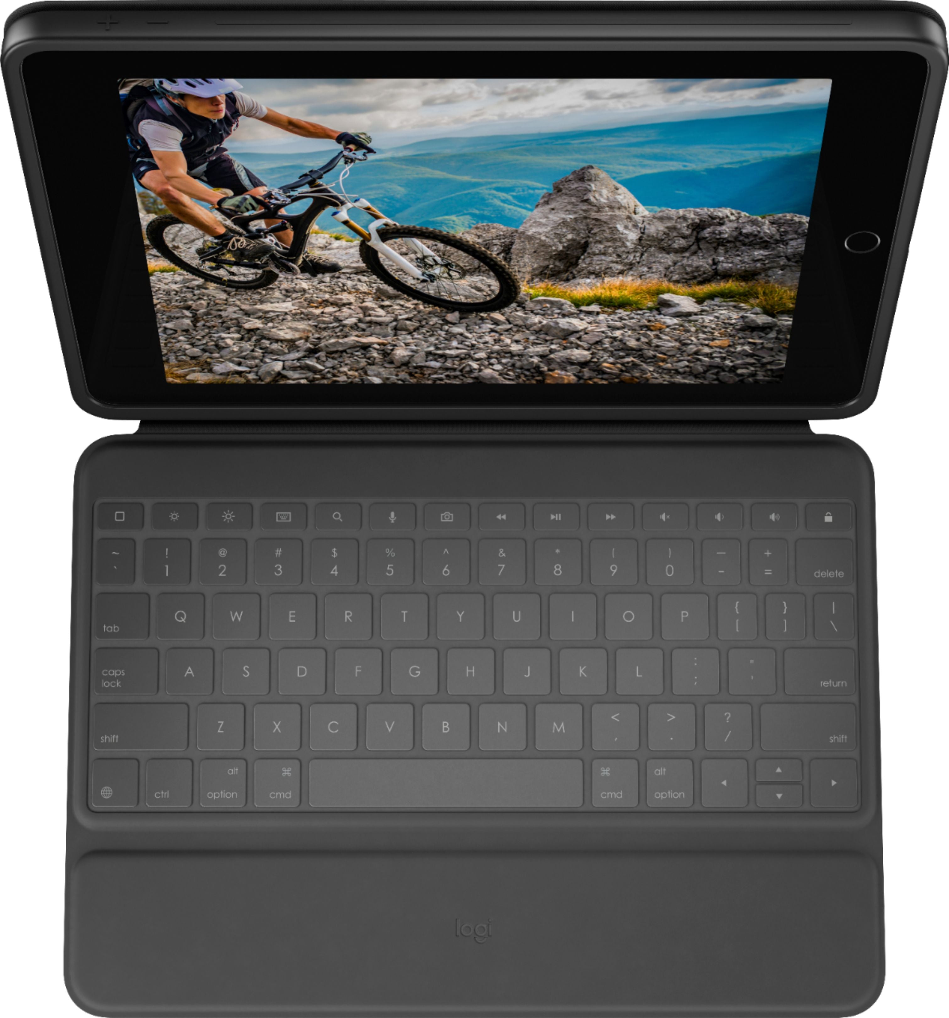 Experience comfortable laptop-like typing on your tablet with this Logitech Rugged Folio keyboard case for 7th, 8th, & 9th generation iPad. A flexible kickstand combined with sturdy hinges ensures you find the perfect angle for the task at hand. This Logitech Rugged Folio keyboard case is constructed with proprietary shock-absorbent material for optimal protection against accidental drops and other mishaps.