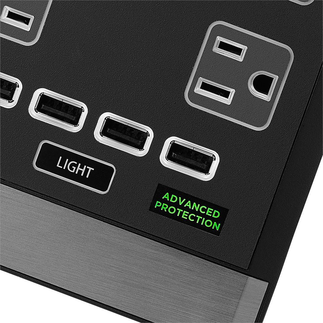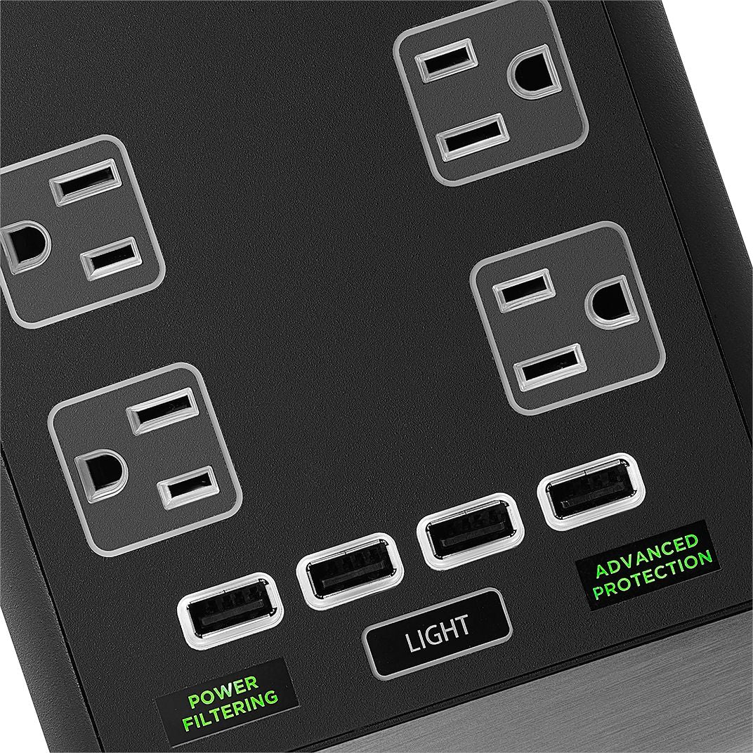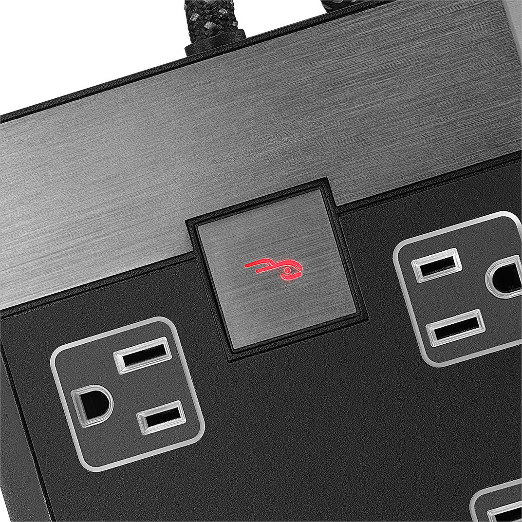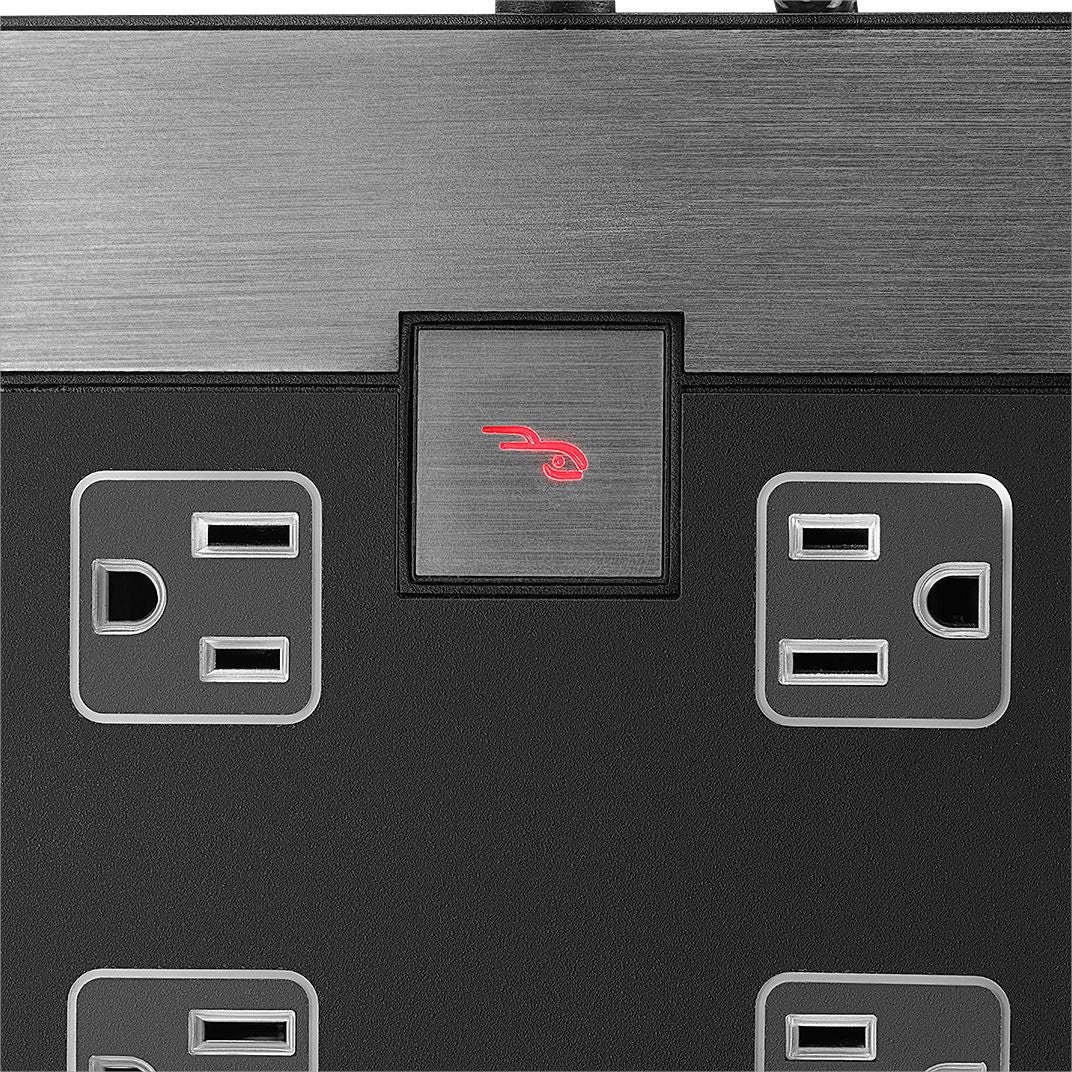 Power your devices with this Rocketfish six-outlet power center. Featuring six surge-protected outlets and built-in two-stage power filtration this power strip protects connected devices against fluctuations and interference. This Rocketfish six-outlet power center makes it easy to keep mobile devices charged with its four built-in USB ports and offers flexible placement with its long cord and low-profile plug.