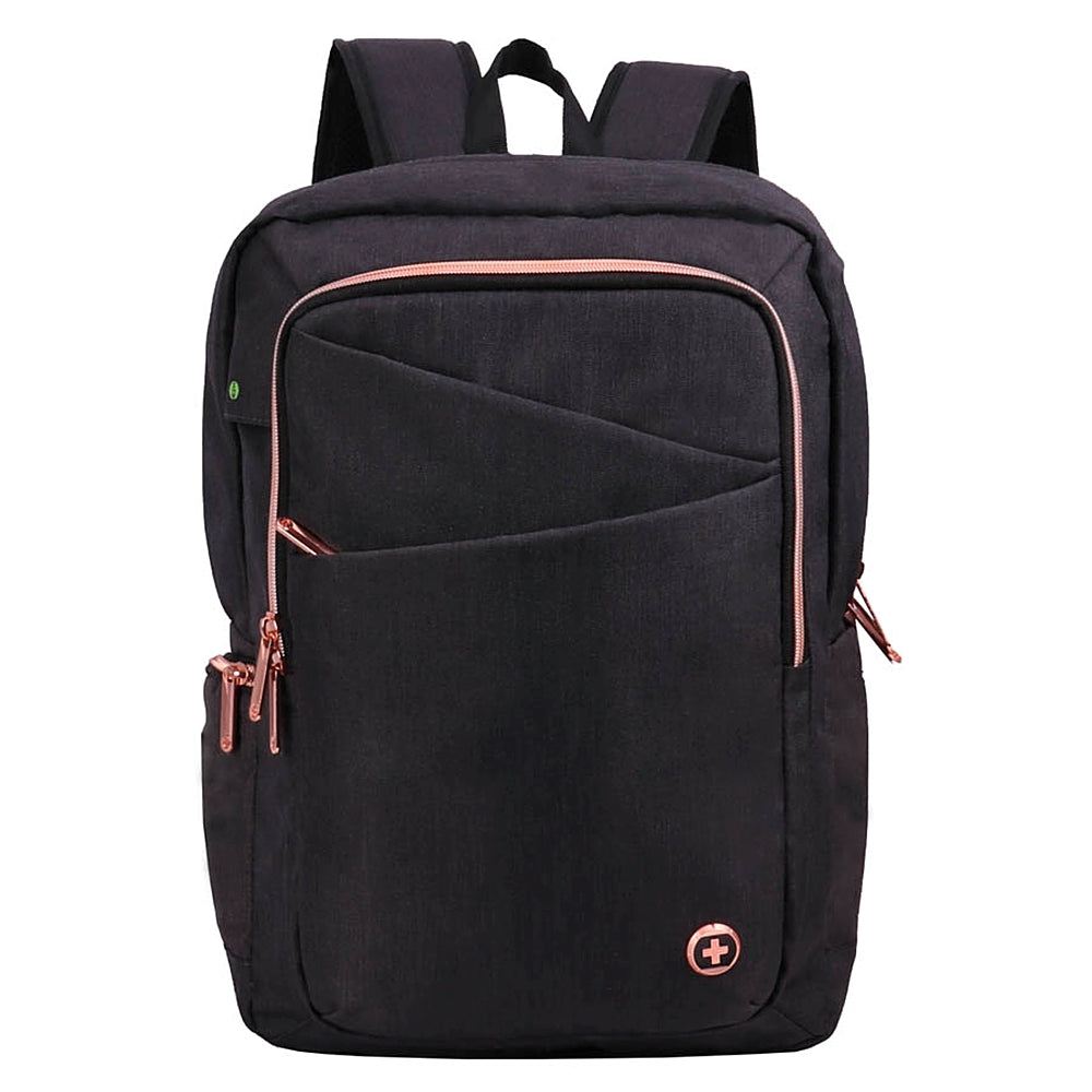The Swissdigital Design backpack products is created for the new "lifestyle, and technology of today's changing world. Take your laptop, tablet, cellphones, books, water bottle, hand sanitizer, mask, and other essentials in your backpack for local trips to school, office, coffee shops, meeting places, parks, beaches, lakes, mountain trails etc... The built-in USB Patented power port allows you to be “ON THE GO. With a power connection that will power up vital accessories (Power Battery Bank sold separately). The backpack body materials are made from water resistance coating to keep valuable items inside dry. RFID Protection pocket keeps credit cards, passport, and personal data safe from an electronic pickpocket. Swissdigital Design has your back…literally! The Katy Rose Backpack provides a sleek black backpack with pink accents. Katy is the perfect bag for students and working professionals. This bag is equipped with high Air-flow design and plenty of storage.