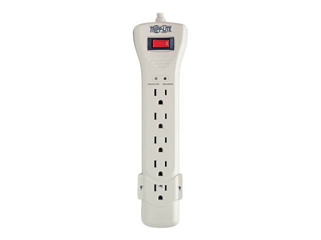 Surge protector with seven outlets is designed to protect electronic equipment against surges, spikes and line noise. Design accommodates bulky transformers without blocking remaining outlets. Surge protector offers EMI/RFI line noise filtering, protection up to 2160 joules, 7' cord with a right-angle plug, diagnostic LEDs and keyhole supports for wall mounting.