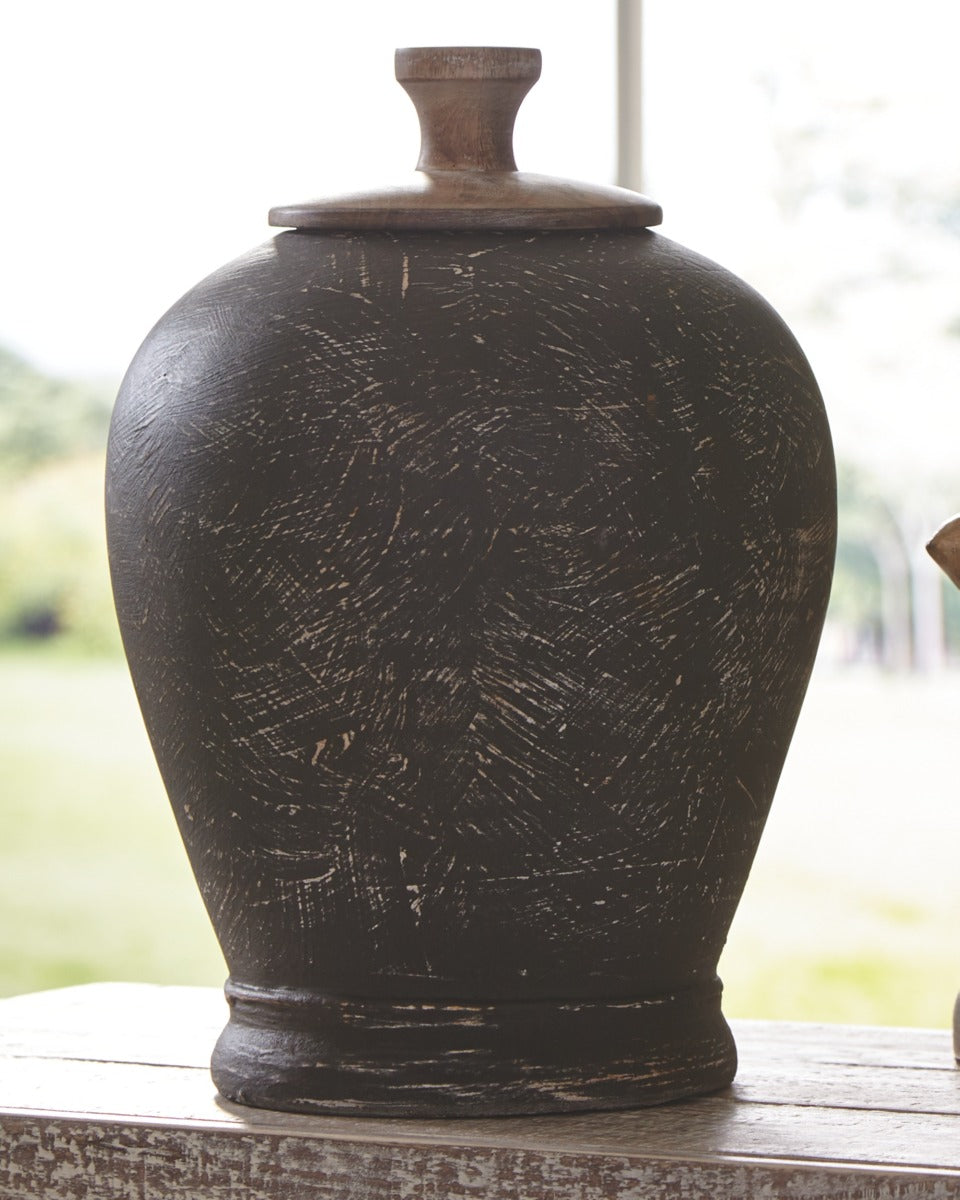 Bring an air of useful object d’art to your space with this decorative jar. With an antiqued black finish and wooden top, this piece blends easily into so many styles.