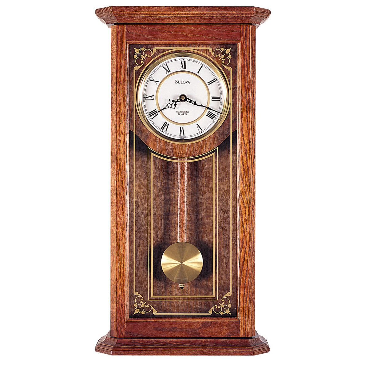 Solid oak case, California oak finish. Metal dial. Westminster melody on the hour. Decorative screened glass.