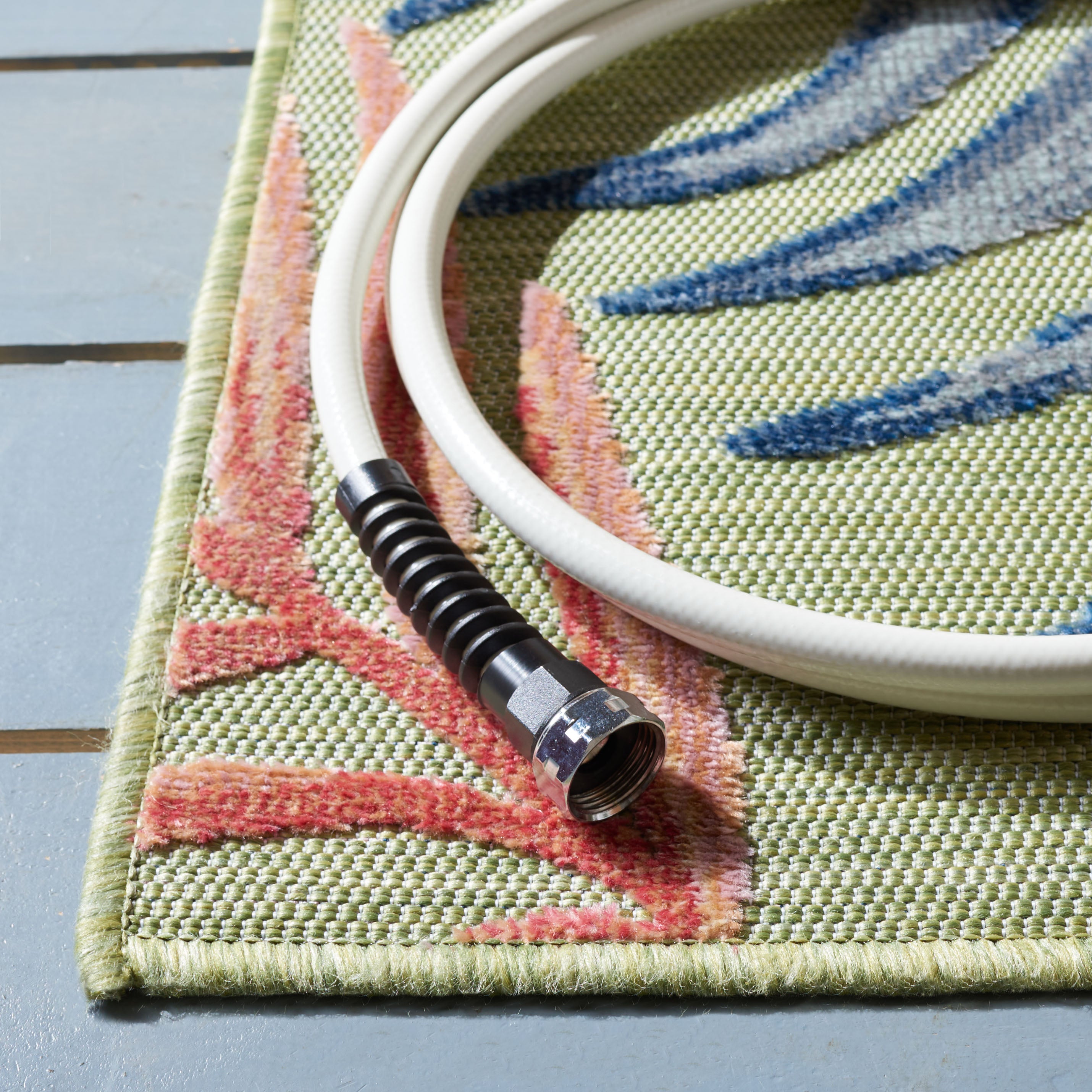 • Indoor-outdoor rugs are made with durable synthetic materials to help them to withstand high traffic and natural weather elements.Outdoor rugs can be cleaned with a bit more vigor, such as rinsing a rug with a garden hose to remove excessive grime.Dry indoor-outdoor rugs over a railing in the sunlight on both sides instead of placing it on a wooden deck or stone patio, which can encourage the growth of moss or mold on a damp rug.