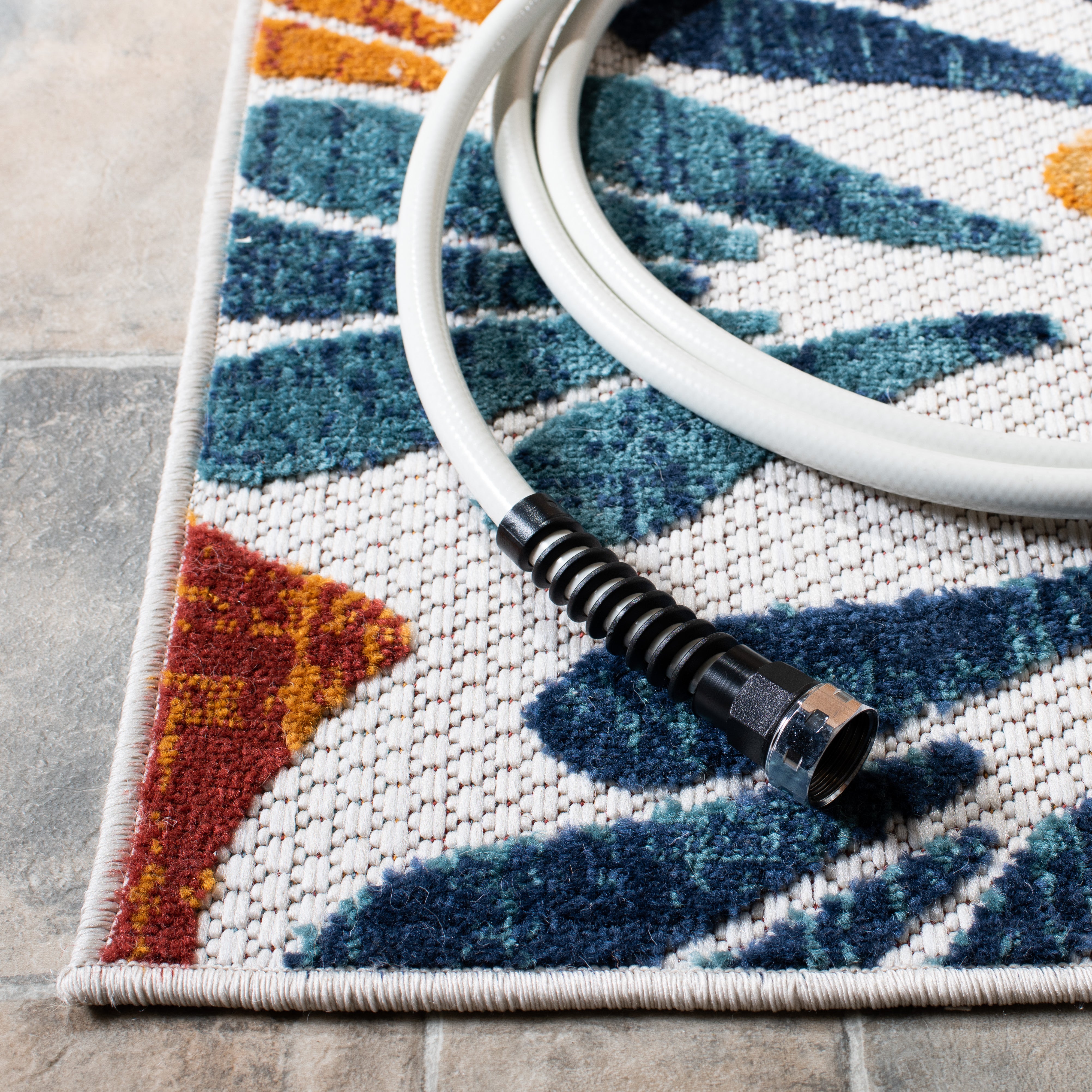 Cabana Indoor/Outdoor Rugs offer a selection of elaborate floor coverings for any busy area of the home, inside or out. Playful florals, lush vines, and fanciful geometric motifs brim with "staycation" vibes on any deck, porch, or patio. Cabana patio rugs are made using durable synthetic yarns for resistance to weather, wear, mold, mildew, and fading from the sun.