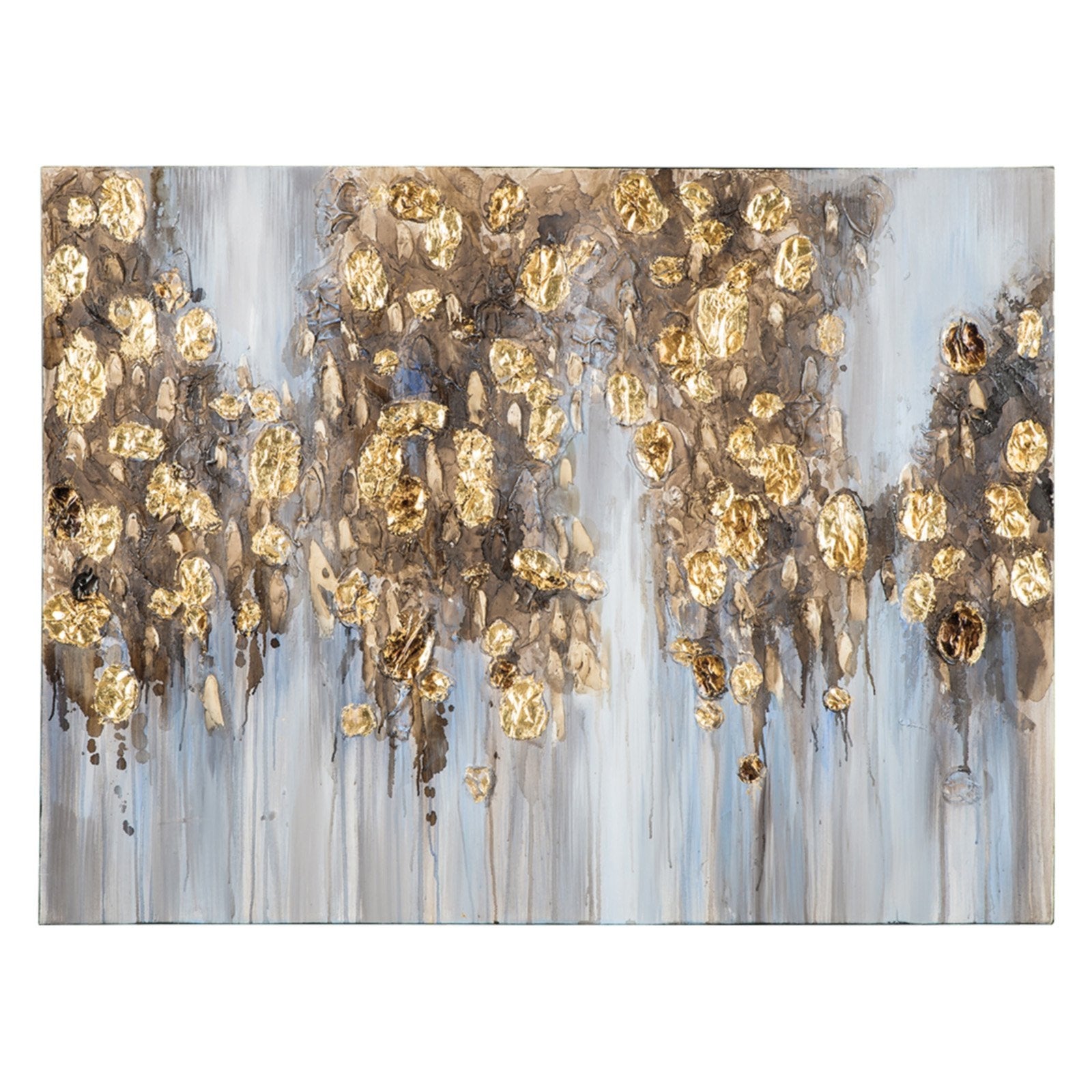 With this canvas wall art, you'll find yourself in a room dripping with gold. Mastering gorgeous abstract expression, this canvas is covered in soft shades of blue. Gold leaf metallic embellishment adds dimension for a positively chic look you can't beat.