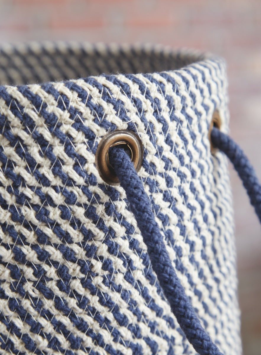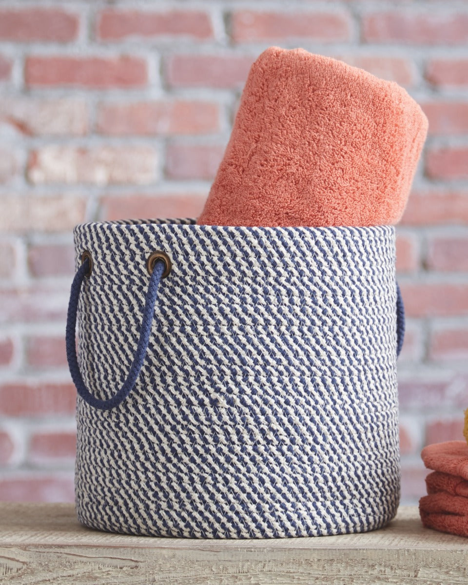 Clutter doesn’t stand a chance with this hand braided basket around. Pick it up by the braided handles and move it to where it’s needed most. It not only provides storage but it’s also stylish. Navy and white design is timeless and teeming with cottony texture.