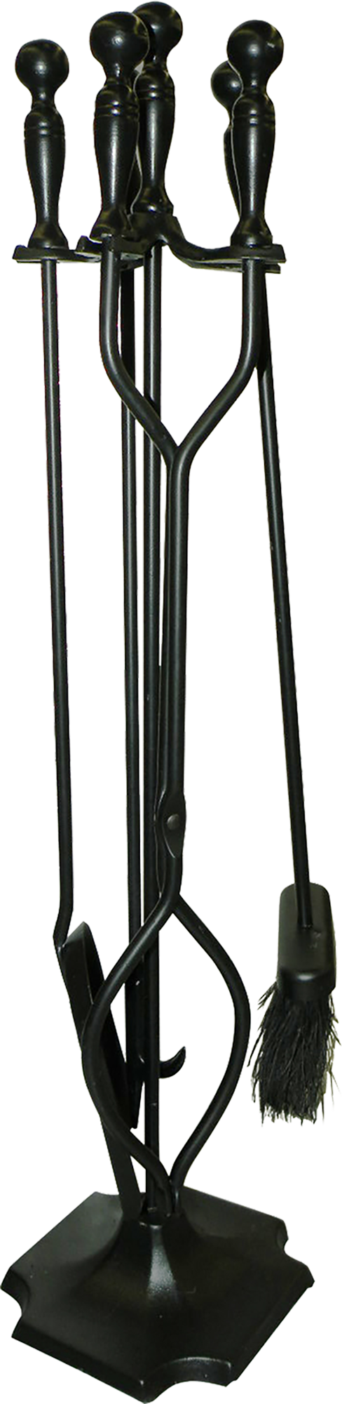 The set includes: (1) Poker for adjusting wood and stoking fires; (2) Tongs to safely place kindling and reposition logs; (3) Shovel for scooping-up used firewood and ash; (4) Brush for sweeping debris; and (5) Heavy Duty Stand. The fireplace poker is constructed of cast iron for years of use. The fireplace tongs help to safely place kindling and reposition logs. The fireplace shovel quickly and easily scoops used firewood and ash. The fireplace brush features strong bristles to easily sweep ash and debris. The heavy duty stand is constructed of sturdy cast iron.