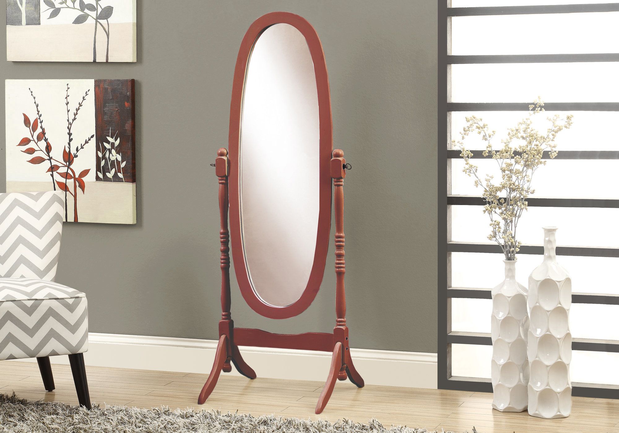 This traditional style solid wood oval floor mirror will be a lovely addition to your master bedroom or guest room. The functional free-standing mirror features an oval shaped glass with a swivel motion for adjustability and ease of use, including details like turn-post side supports for a classic touch. Finished in a rich walnut brown with a sturdy curved base, this mirror makes a beautiful and practical accent piece for any bedroom in your home.