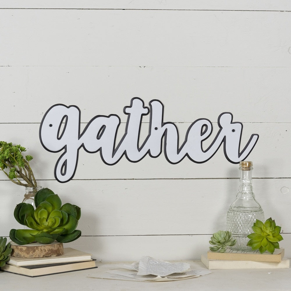 Metal sign featuring the word Gather. Perfect for your family room, gallery wall, front door, entryway or kitchen.