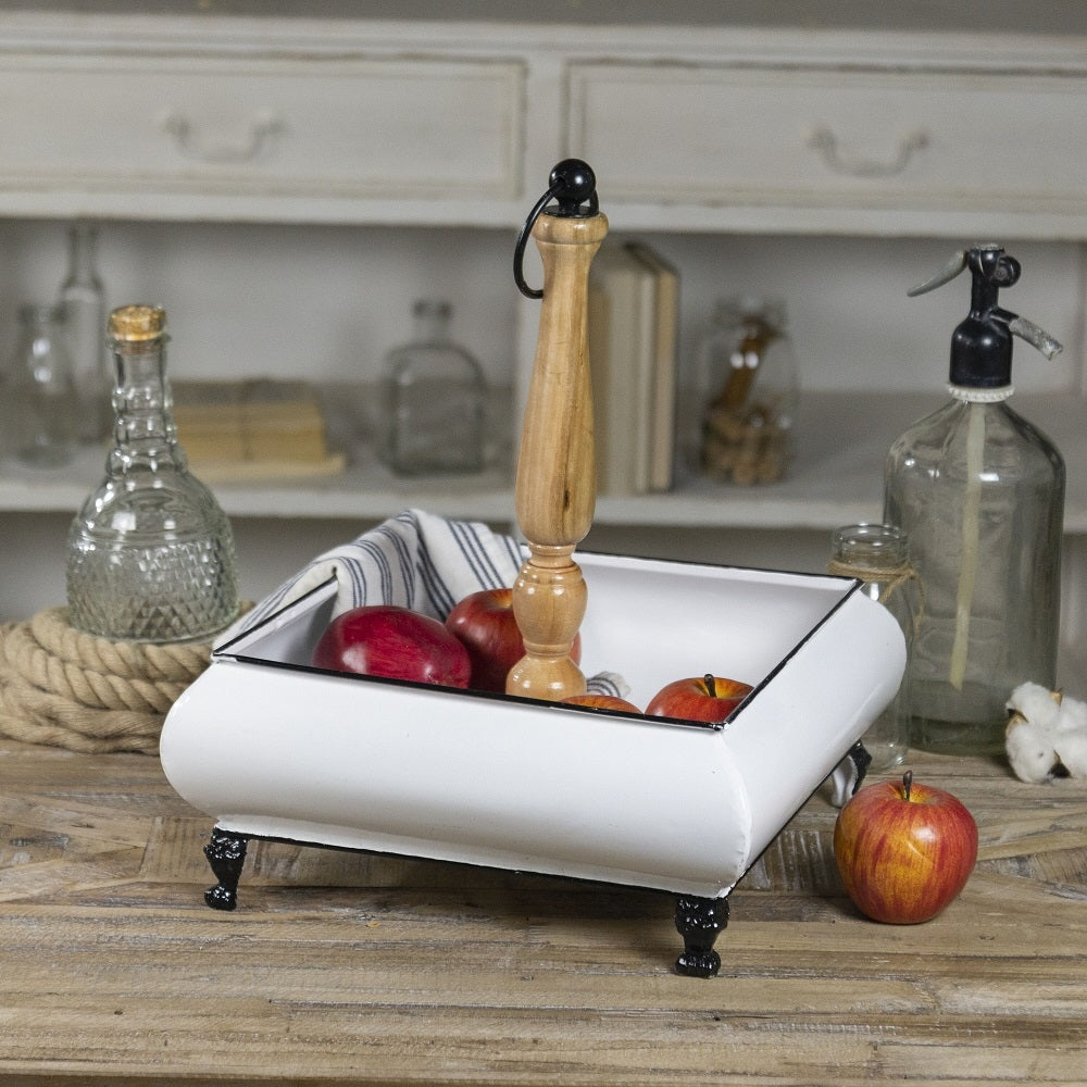 This white enamel tray is so perfect. The small tray is perfectly accented by the wood center handle. This is perfect for a kitchen or bathroom.