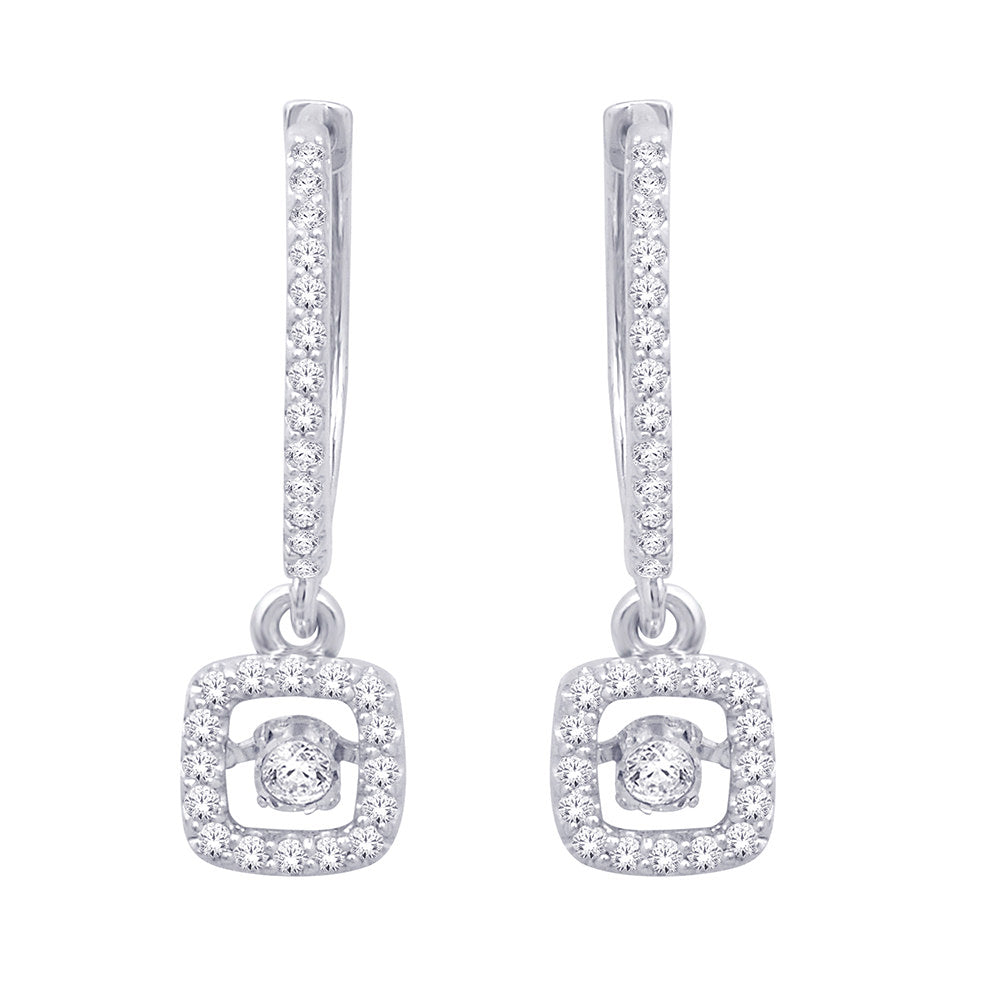 Crafted in 10K white gold, each earring dangle features a looping square-shaped frame that sparkles with 0.40 ctw diamonds. At the center a single diamond glistens in a unique setting that moves with every beat of her heart and every turn of her head.