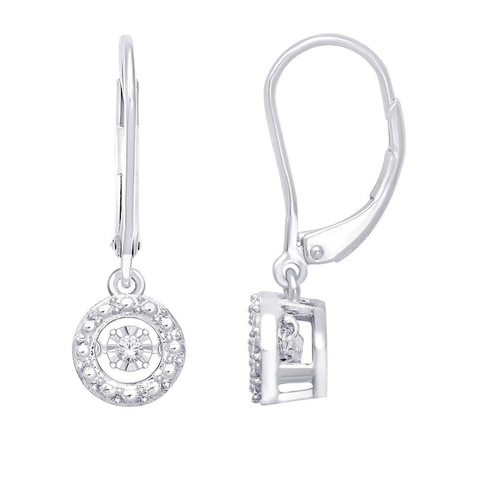 These Diamond Drop Earrings are crafted in Sterling Silver and each earring Features a round Moving Diamond at the centered weighing approximately 1/20 Ct. Tw. The center diamonds surrounded by Lumina plates which enhance the look of diamond. Bold And Stunning, these Earrings make a magnificent accompaniment.