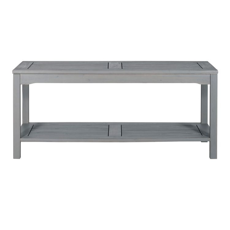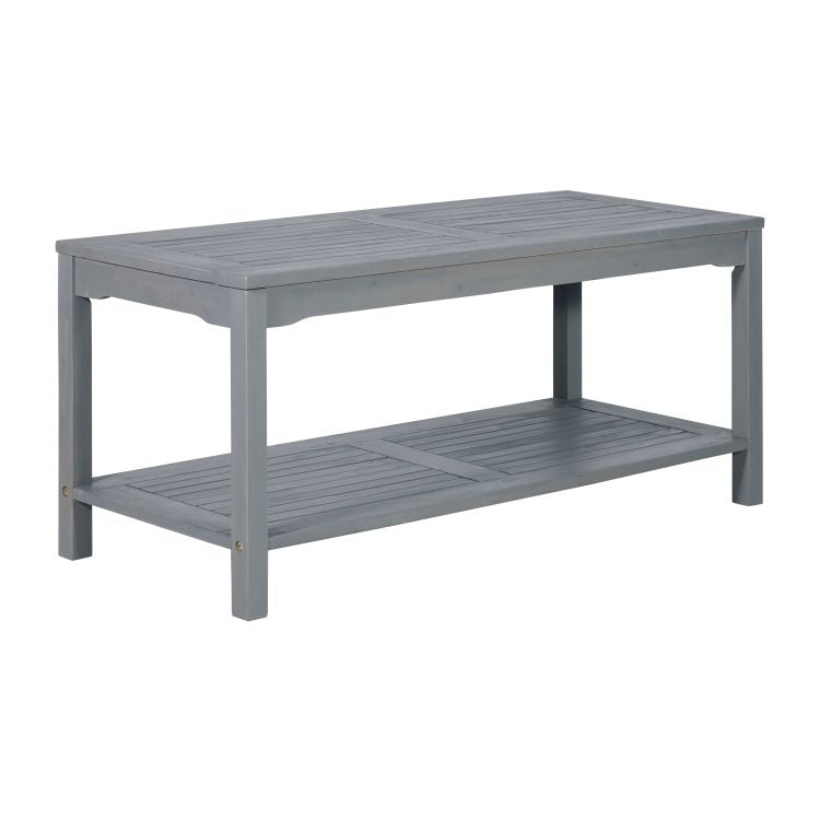 This stylish coffee table offers two levels to provide you ample storage for your outdoor accessories. Crafted from solid acacia hardwood, this table is naturally stylish yet durable to last summers to come. Set next to a loveseat or chairs on your patio or deck so you'll always have a spot to enjoy a drink or snack outdoors. Pair it with our matching loveseat and chairs for a complete patio set.