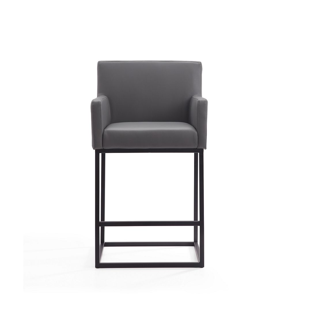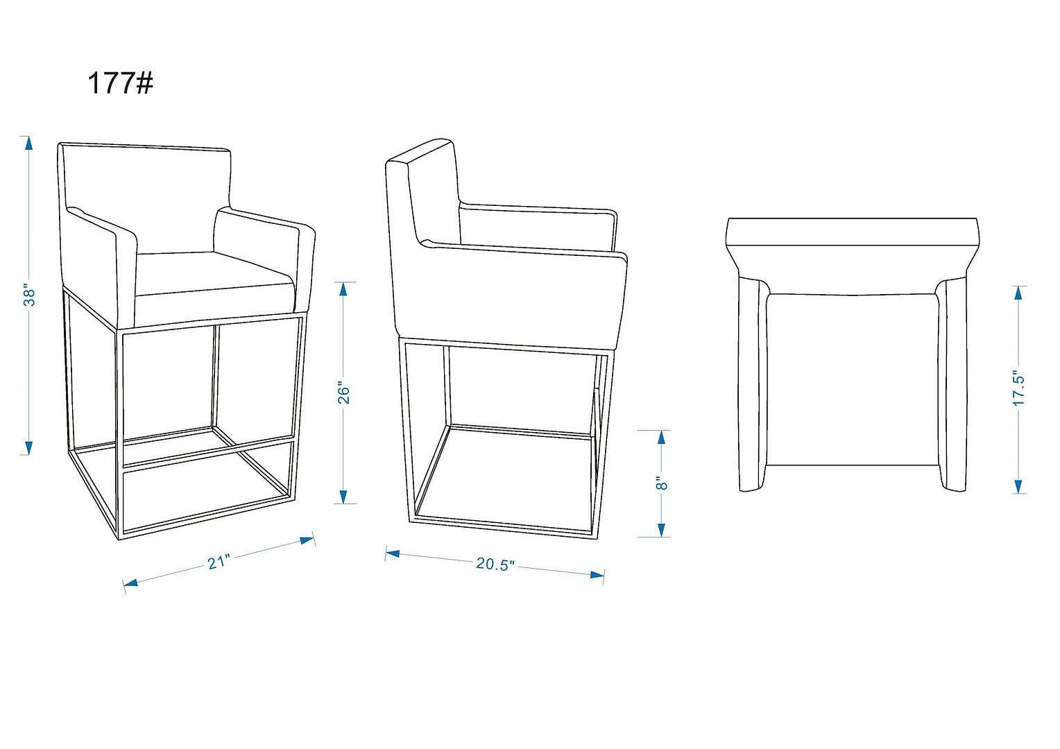An eye-catching modern profile with a touch of glam. Genuine Leather wraps the cleverly shaped arms, back, and gently cushioned seat, resting on sturdy, slender metal legs. A footrest runs along the front of the stool, providing added comfort to this chic piece. 20.5"L x 21"W x 38"H