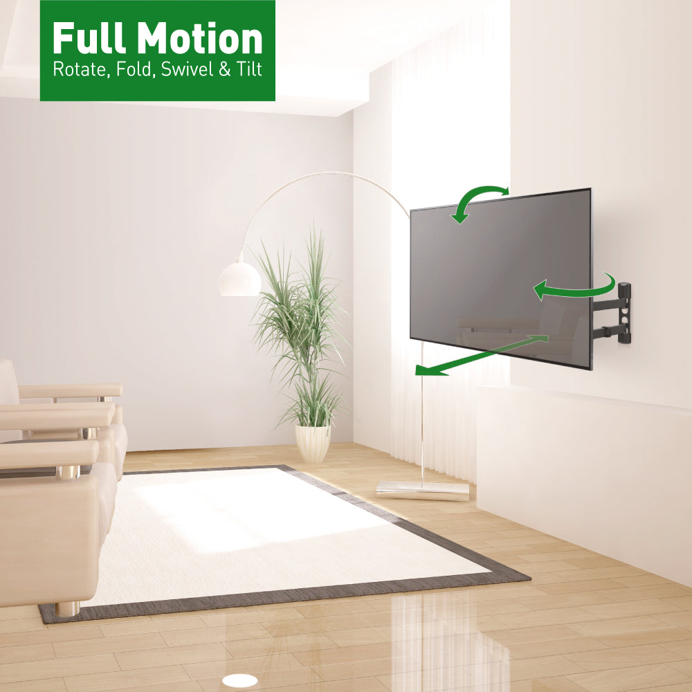 The Barkan full motion, four - movement TV mount with rotate, fold, swivel and tilt options fits flat / curved screens sizes 13 - 65 inches and weight up to 88 lbs.
