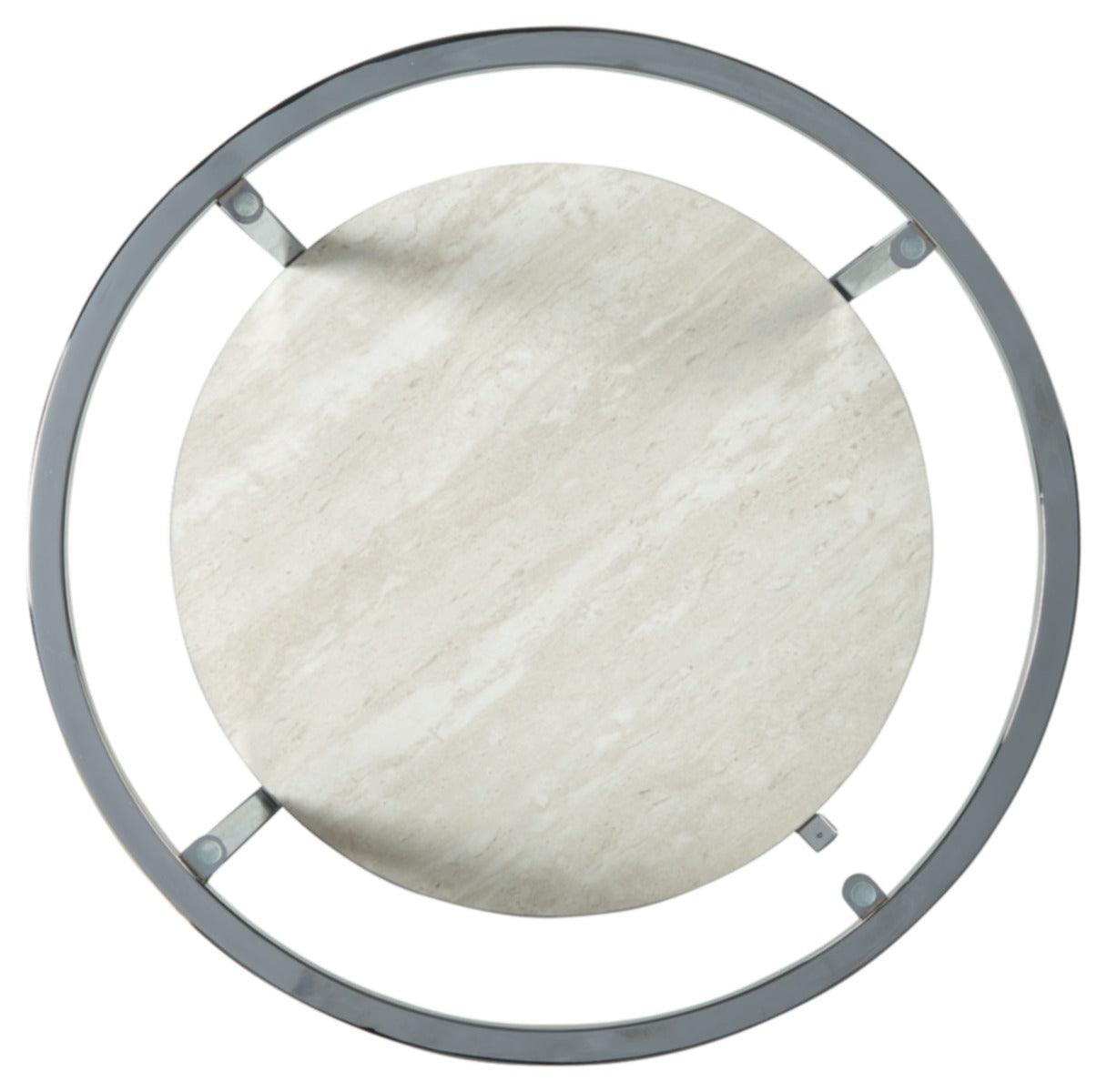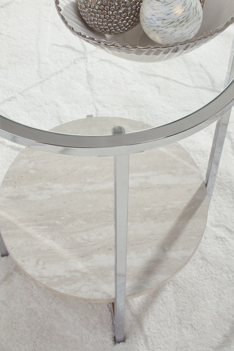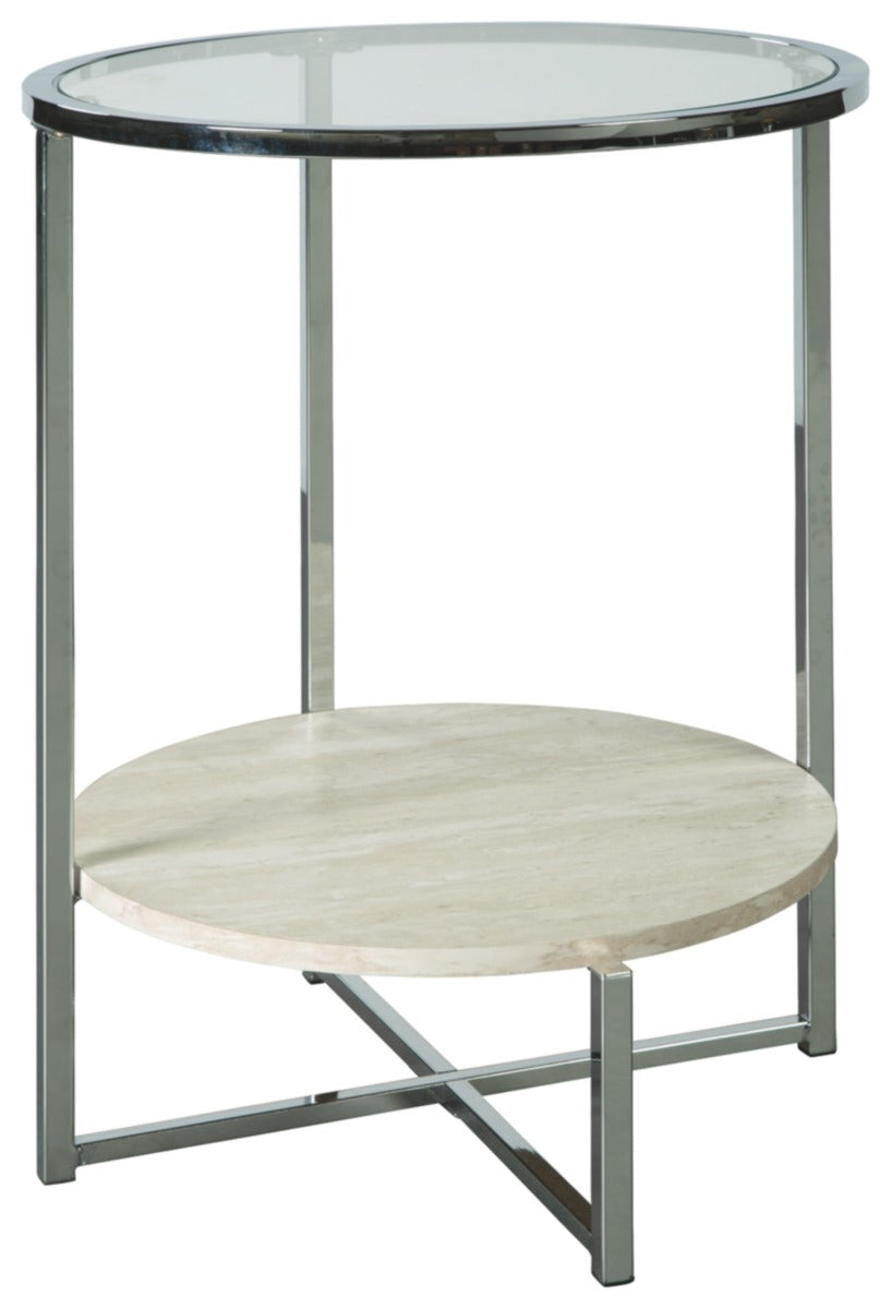 Contemporary style gets a modern attitude in this end table. A tempered glass top showcases the replicated travertine stone shelf. The open design of the metal frame creates open space to offer the illusion of more room.