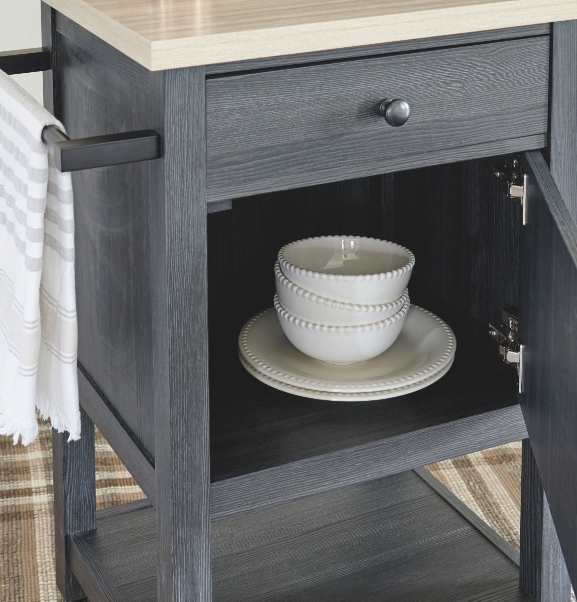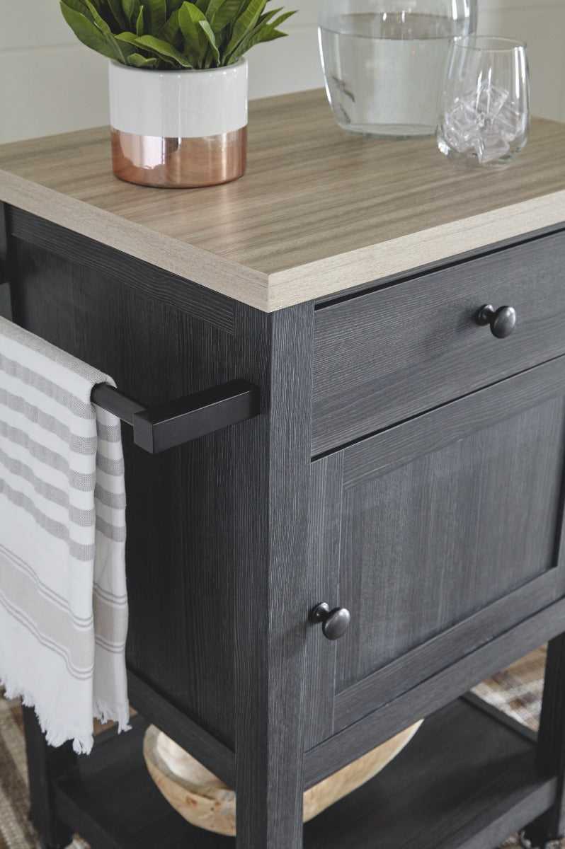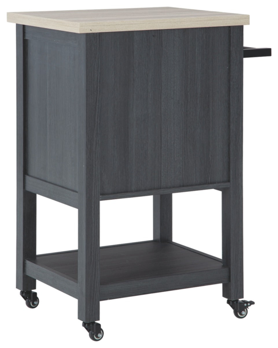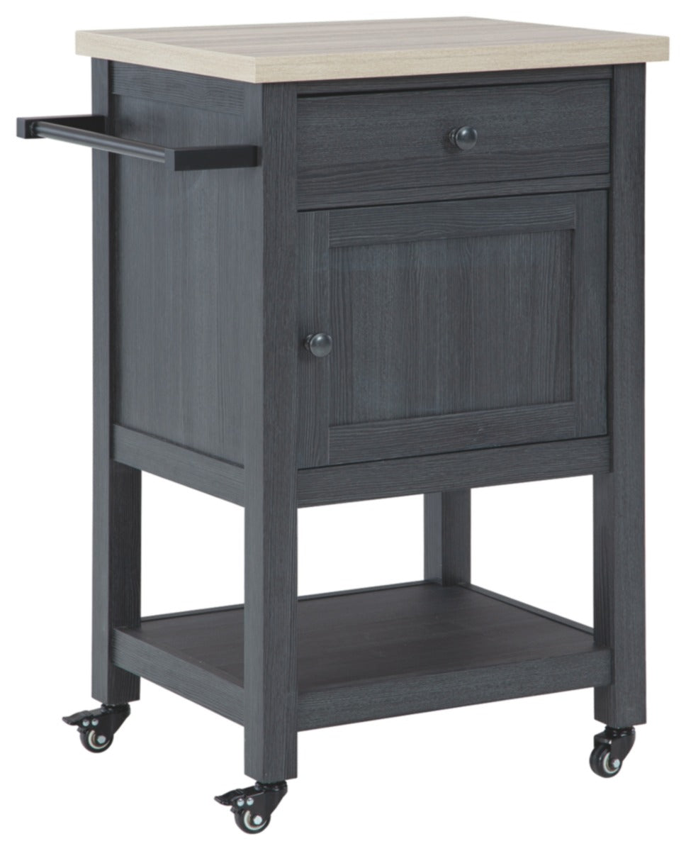 Roll out rustic flair with this ultra-cool rolling cart. Whether serving as a mobile cocktail station for entertaining or serving up style in the dining room, this easy-going cart with durable melamine top and locking casters offers so much durability and versatility. Complete with 1 door concealing additional storage, 1 drawer, towel bar and fixed shelf, this cart simply says welcome home.