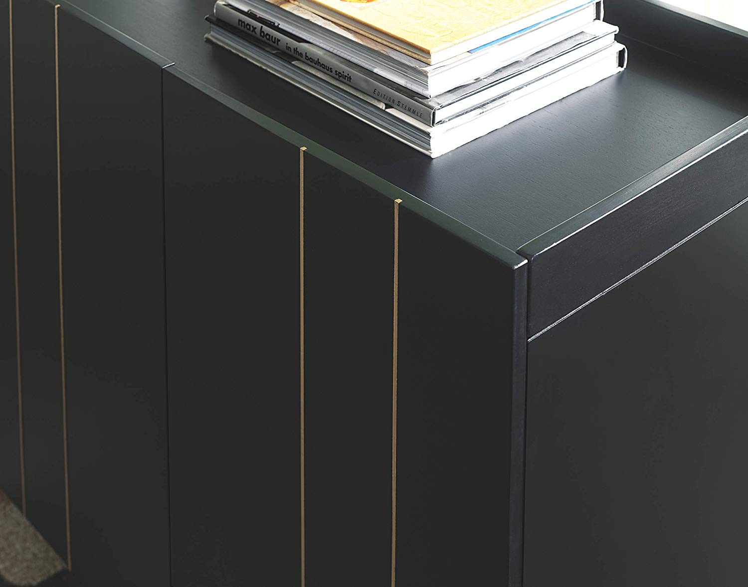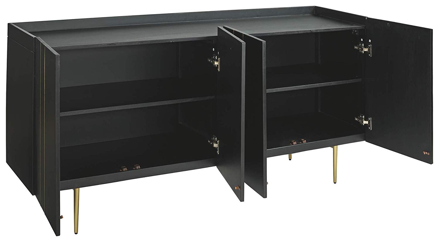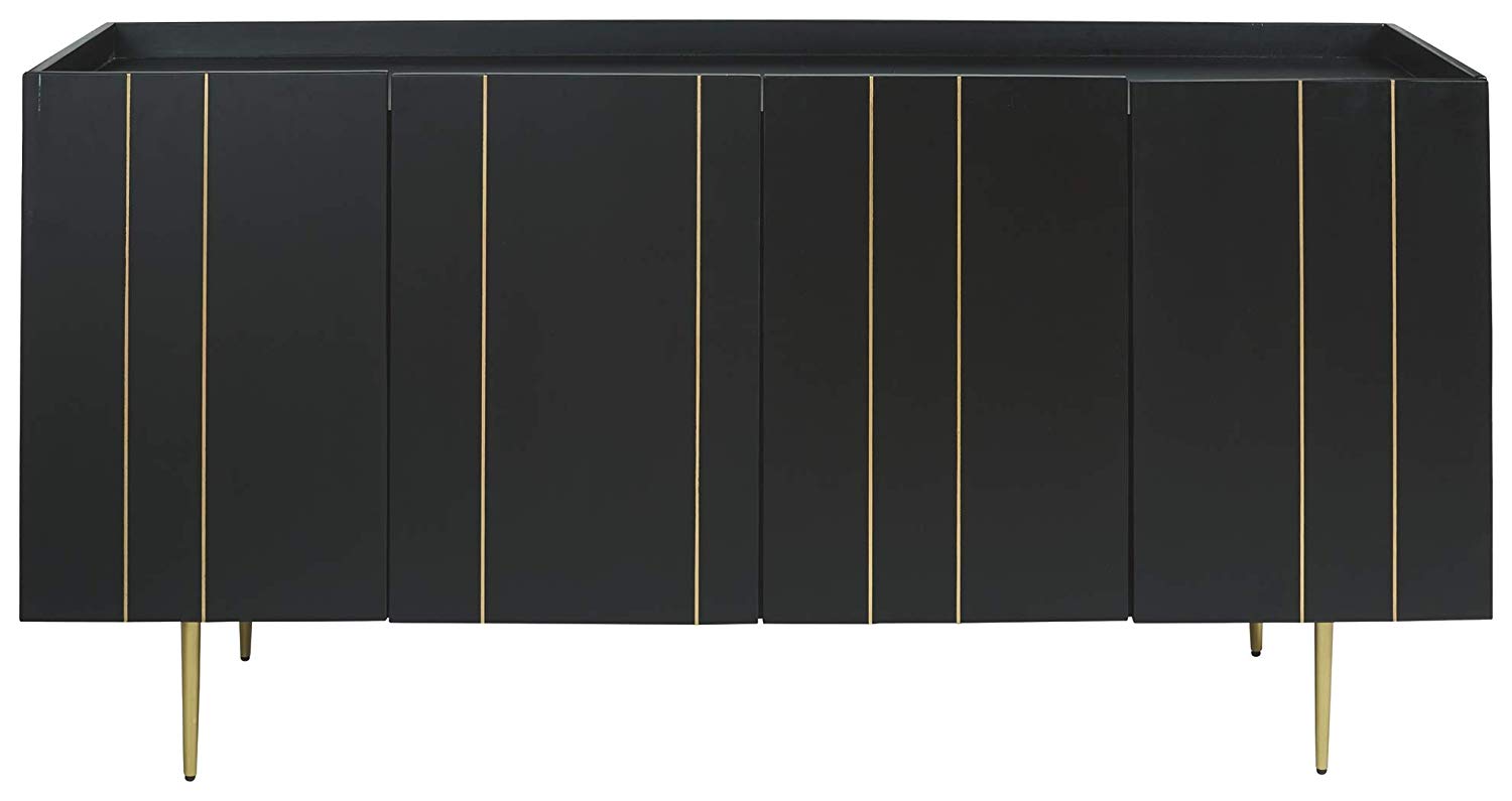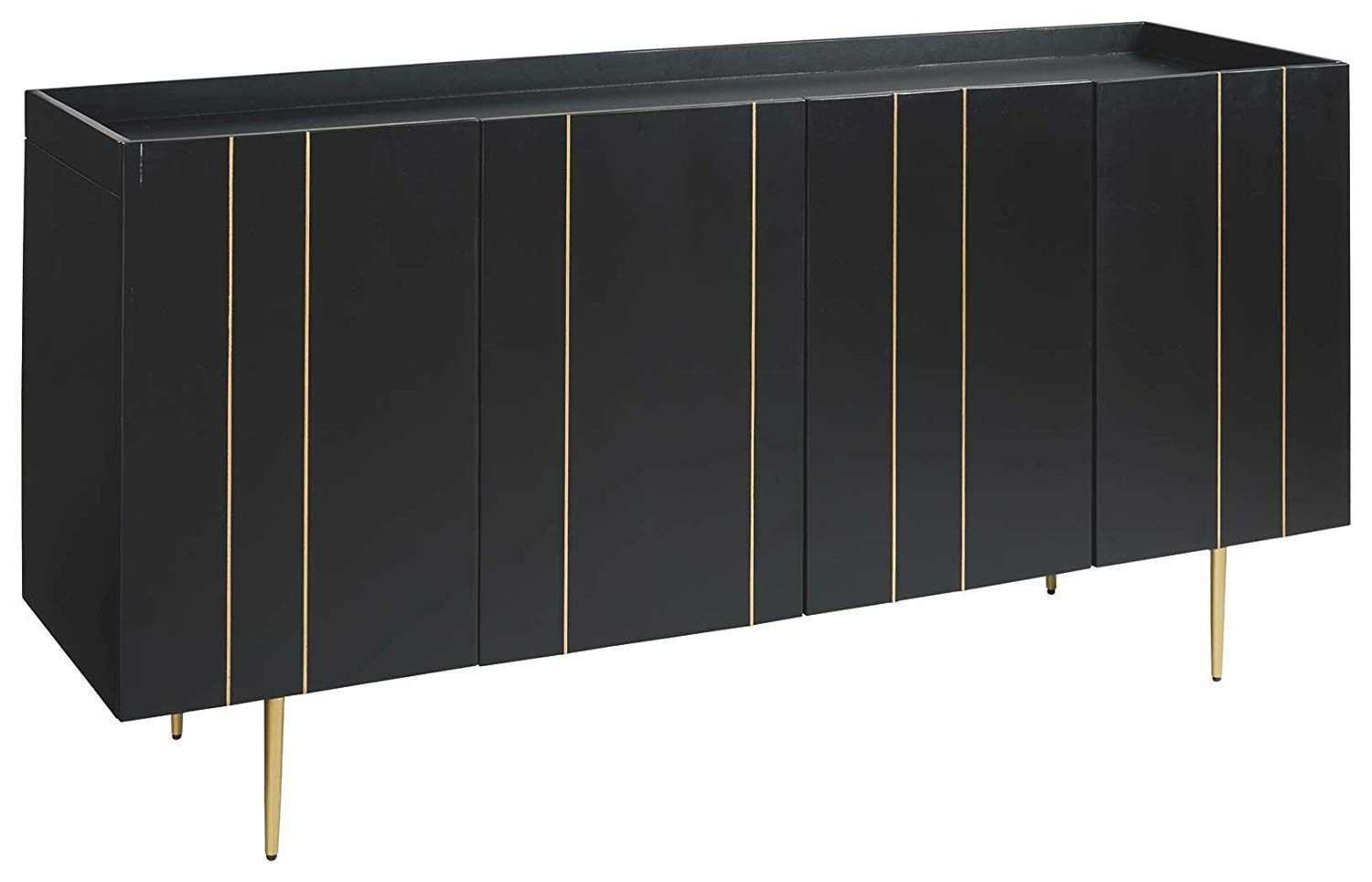 This accent cabinet is beautifully aligned with your love of contemporary style with a high-glam twist. Finished in brilliant black, this quality crafted solid wood accent cabinet is enriched with thin metal inlays and tapered metal legs in a goldtone finish for upscale appeal.