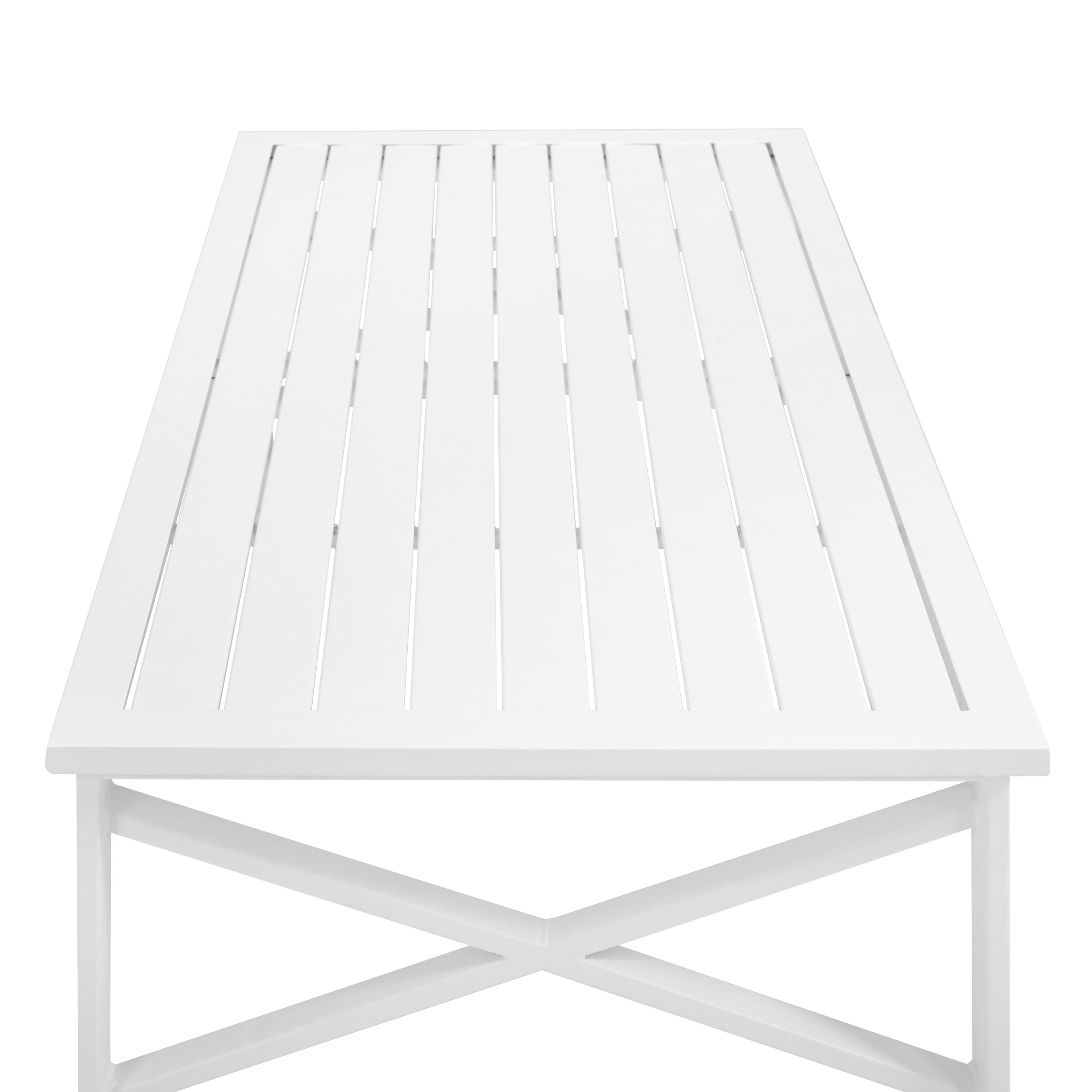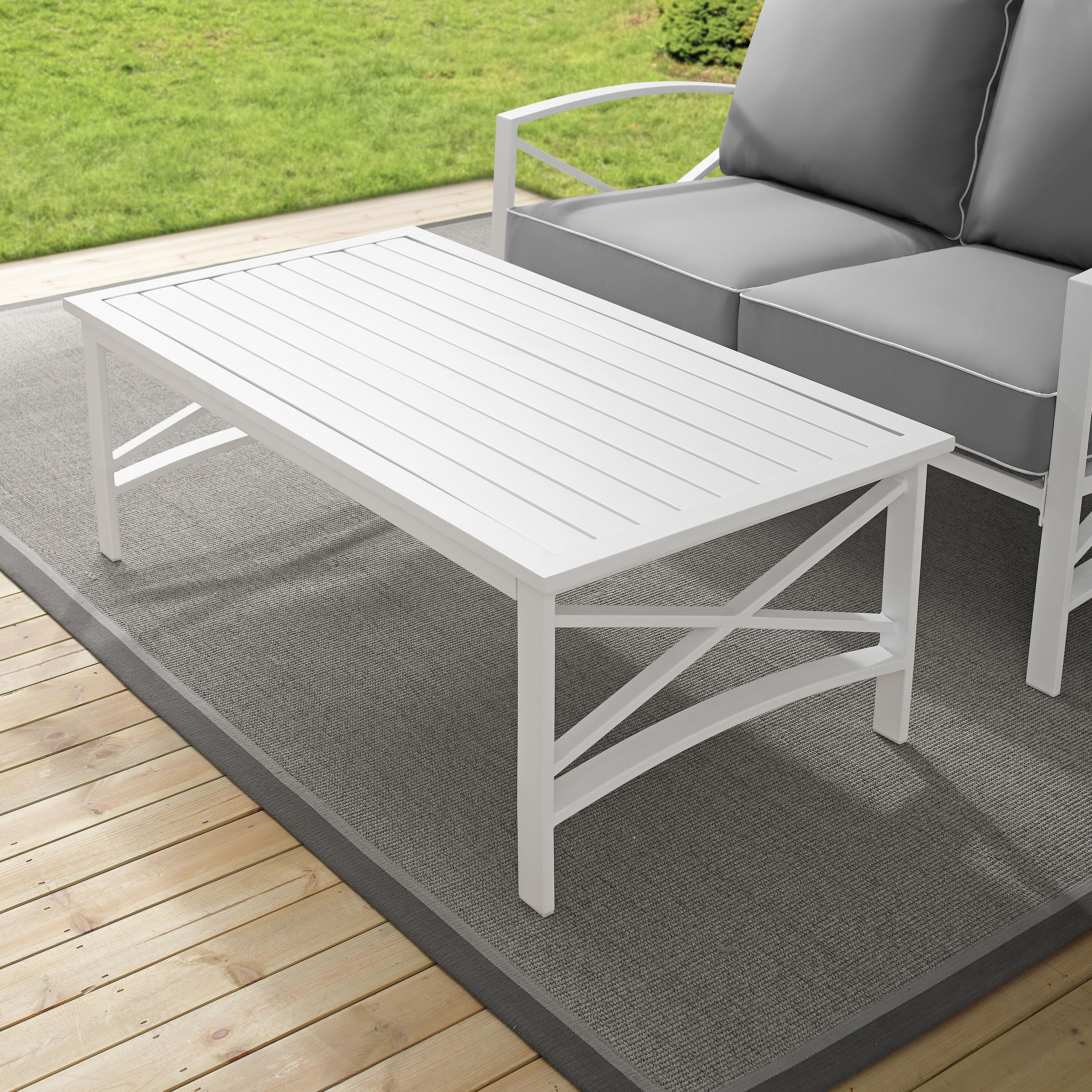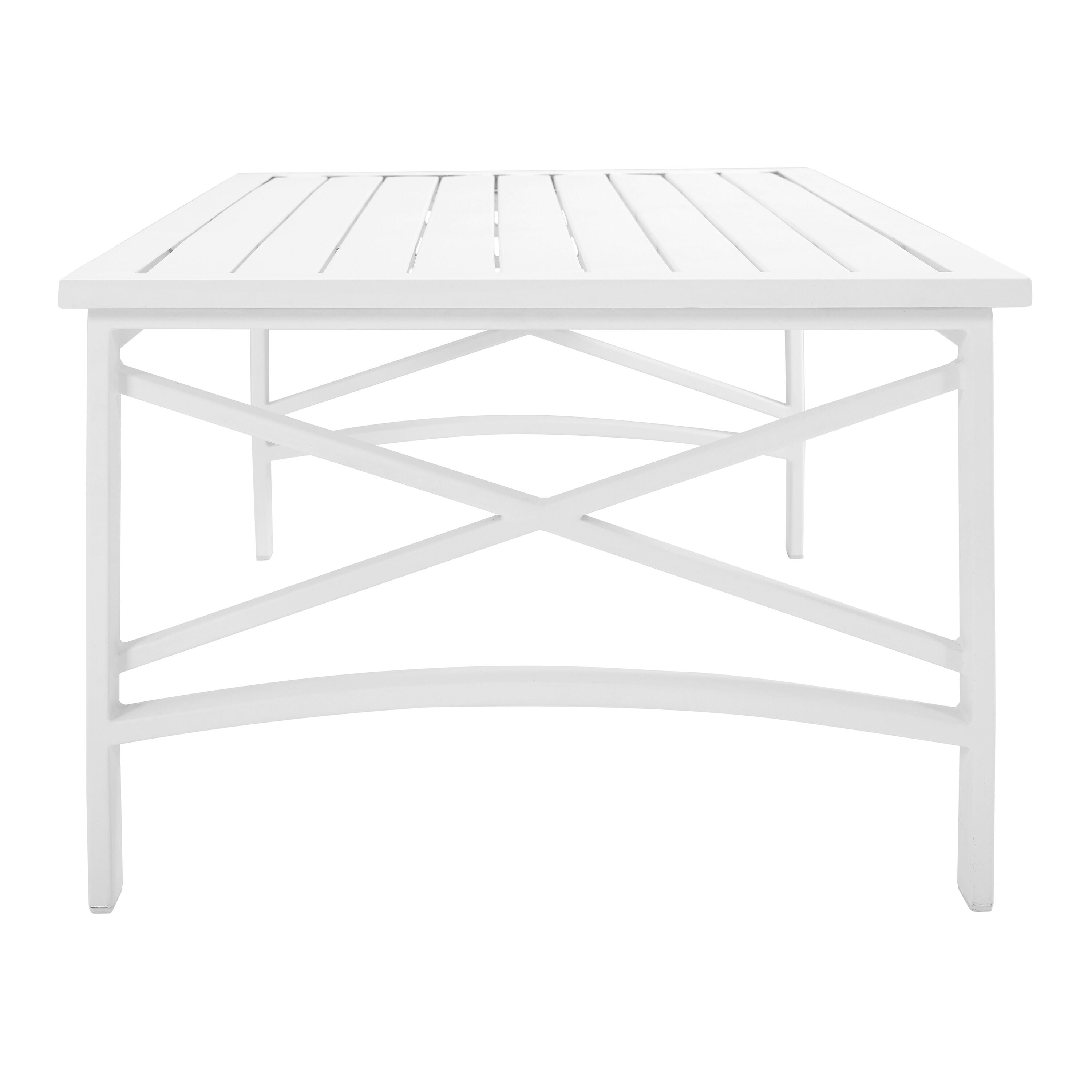 Entertain outdoors with the Kaplan Coffee Table. This contemporary design pairs well with the rest of the Kaplan Collection, as well as other styles for a more eclectic look. Durably crafted from all-weather rust-protected steel. Classic x-bar supports and a slatted tabletop create subtle visual interest in the elegant aesthetic.