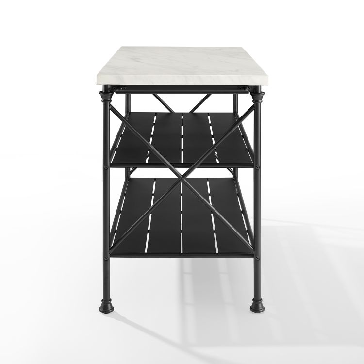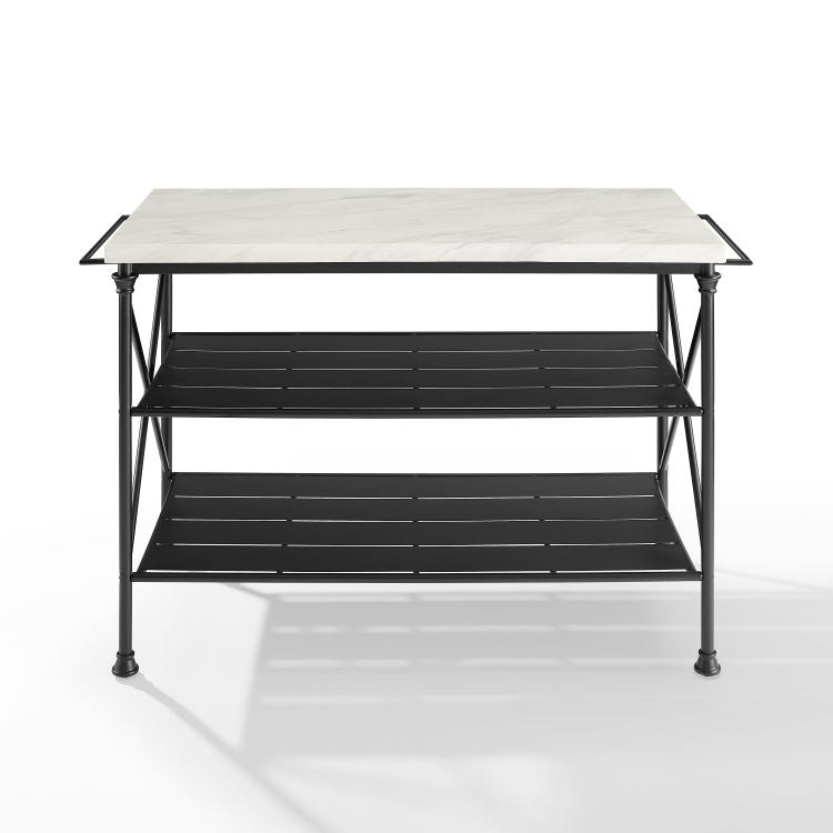 Inspired by the French industrial revival, the Madeleine Kitchen Island brings a stylish aesthetic to the kitchen with its faux marble top and steel base. Two large open shelves provide ample storage while two towel bars add convenience to your kitchen prep. Used as a standalone kitchen island or paired with counter height bar stools for added dining space, the Madeleine Kitchen Island is a fashionable and functional addition to any home.