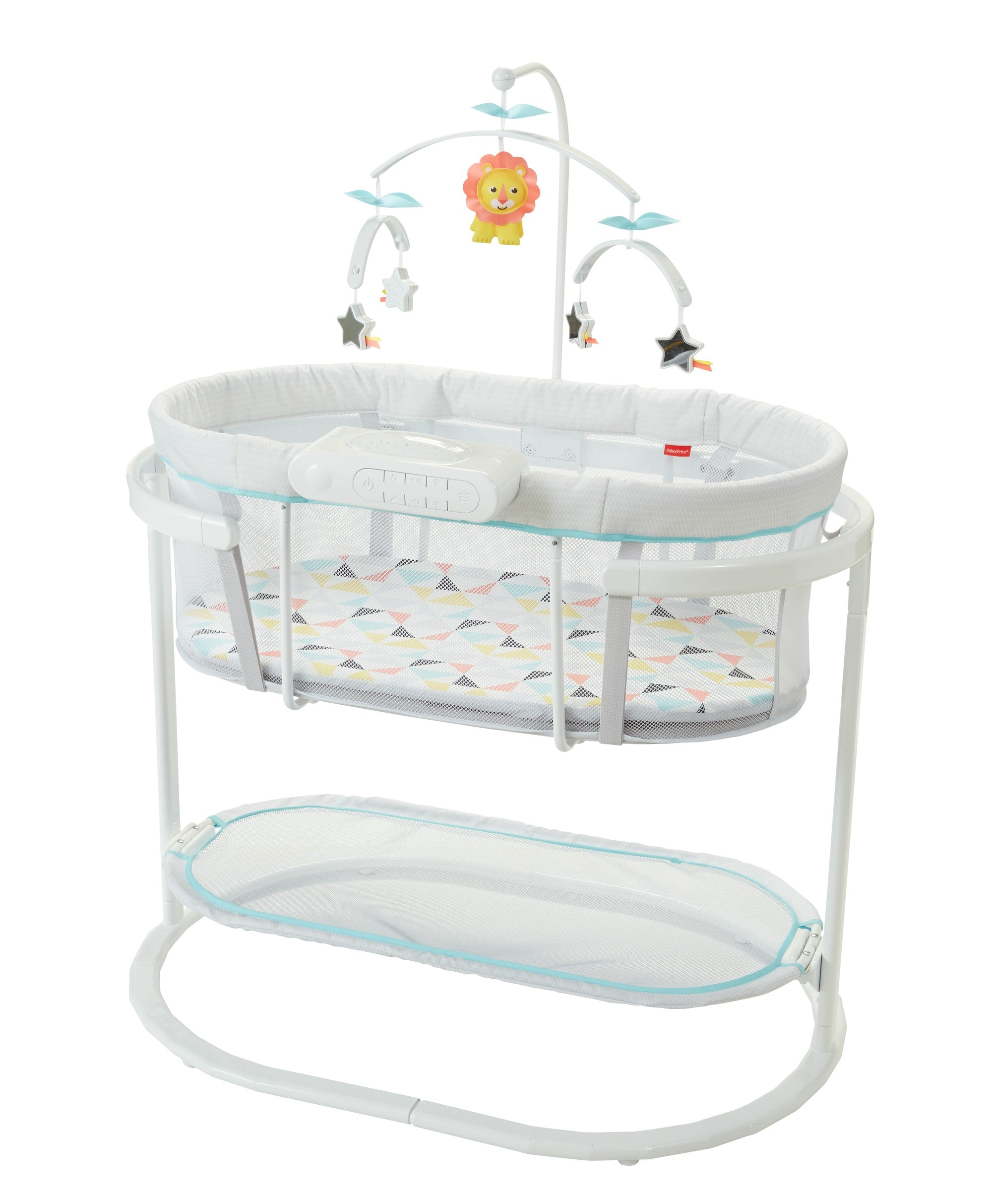 Dreams of swaying to sleep on a fluffy cloud beneath a starry sky become a reality with the Soothing Motions Bassinet (minus the cloud, that is). The bassinet's soothing sway, mesmerizing lights, cute mobile and more will help baby catch those zzz's in no time. From soothing sways, music and sounds to calming vibrations, light projection and more, the Soothing Motions Bassinet has everything to help your baby drift off to dreamland in comfort. As little ones relax on the comfy sleeping pad, they can look up at the mesmerizing overhead mobile with stars while they gently sway. Or, turn on one of the captivating light features, like the overhead projection. You can also remove the projector from the bassinet and use it as a tabletop soother! And, there's a convenient night light setting for an added sense of security. For extra coziness, activate the 30 minutes of calming vibrations and serene songs or sounds. Sweet dreams, baby! Use only with a child who is unable to push up on hands and knees, pull up or sit unassisted.