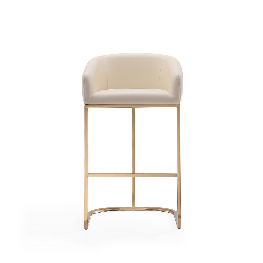 A hint of mid-century modern style that brings the chic and elegant flair to any home's decor. This stool is all kinds of wonderful. A clean-lined, curved, and comfortable seat, sits atop a shimmery gold semi-circle pedestal base. A metal footrest finishes the look, bringing added comfort to the leather-upholstered piece. Gorgeously well-served, in a perfect neutral tone for that touch of warm texture. 21"L x 20"W x 40"H