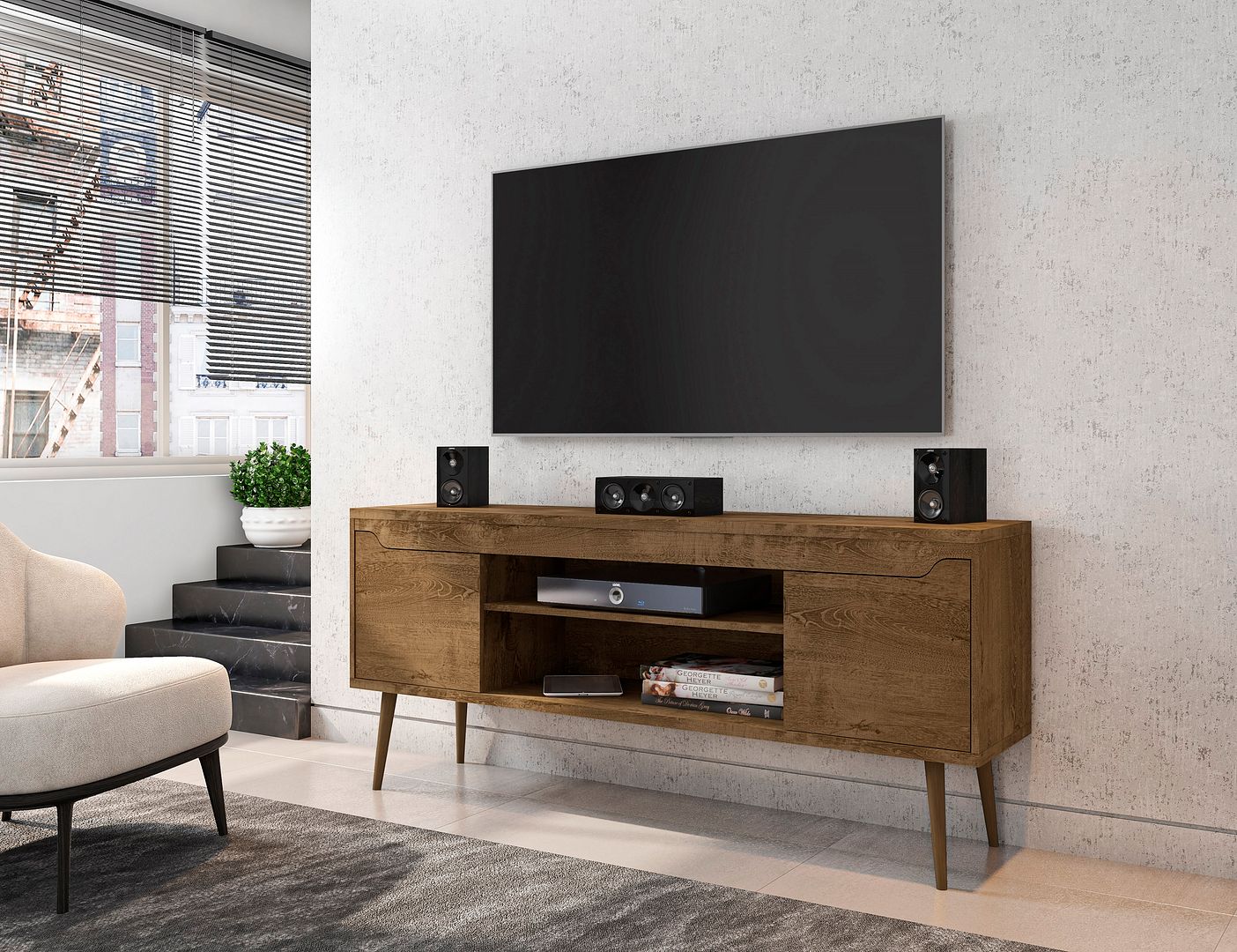 Mid Century - Modern Free Standing TV Stand for Living Room and Bedroom use. * Mid Century - Modern Free Standing TV Stand for Living Room and Bedroom use. * Recommended for a 46" -60" TV. * Includes 1 Media Hole for Wire Management. * Fashionable Splayed Legs made from Solid Wood for Extra Durability. * Includes 2 Open Shelves and 2 Large Concealed Storage Compartments. * 90° Open Door Style with Soft Close Features. * Home Assembly Required. All Hardware Included.