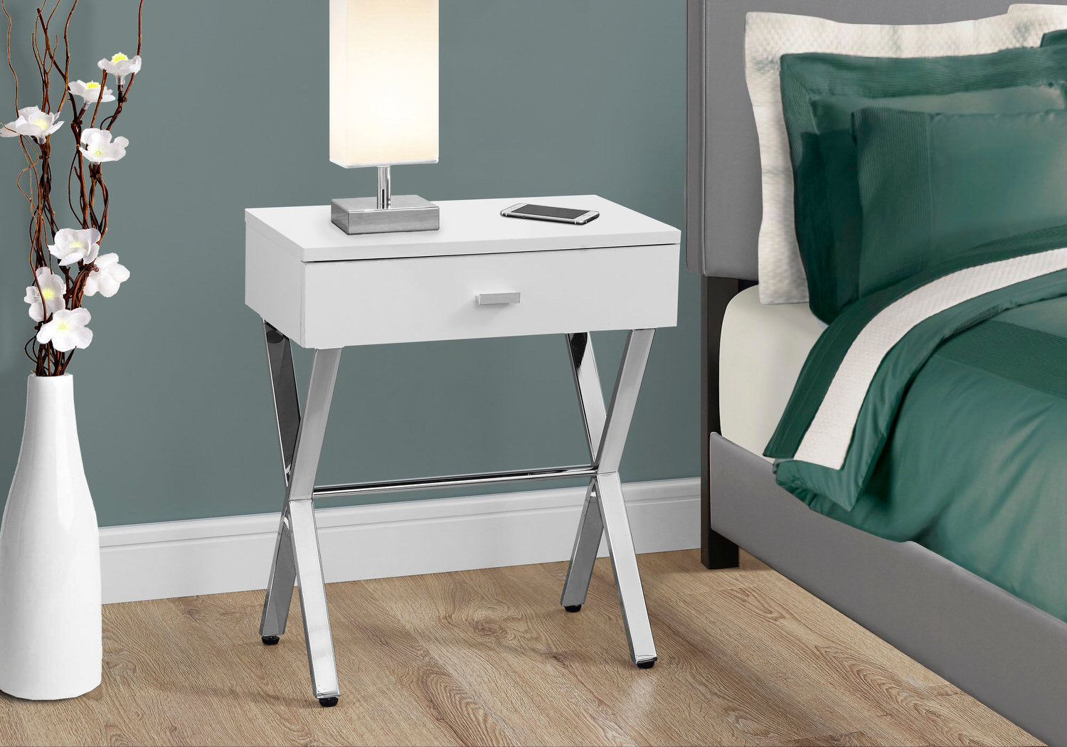 Influenced by the design accomplishments of the past, this mid-century inspired table has gone through a modern make-over. The iconic lines and styling of this side table paired with the on-trend glossy white finish and chrome metal X base legs, give this table an edgy look that will complete your modern room setting. This versatile table can be used as an accent table in the den, living room or entry way or as a night stand in the bedroom. Featuring one storage drawer with a chrome handle, this sturdy accent table is perfect to display your favourite objects and keeping things organized in one place.