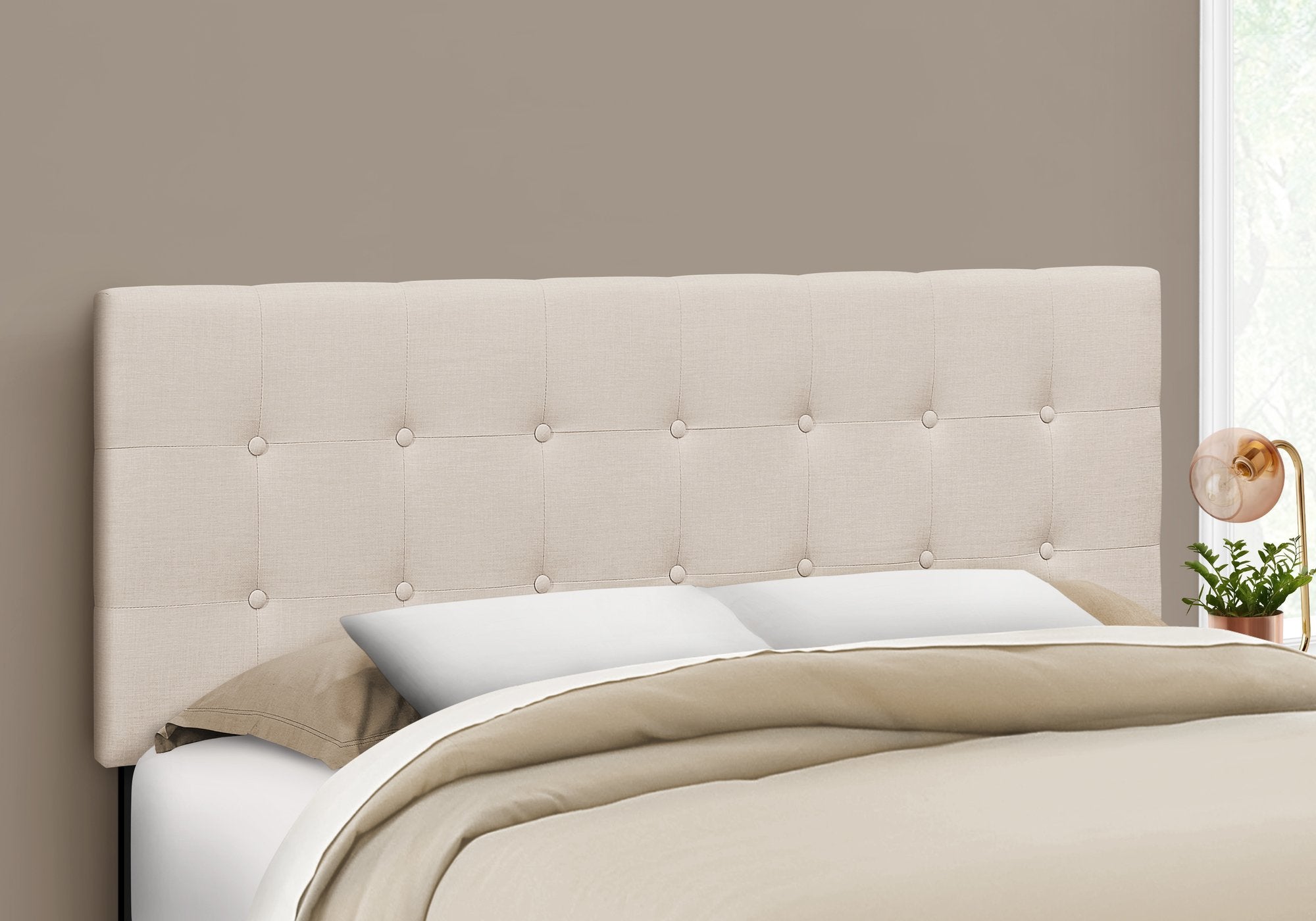Button-tufted upholstered headboard in a beige linen-look fabric