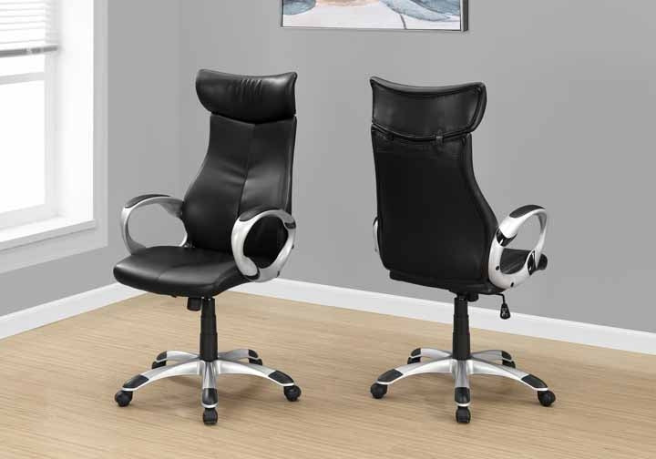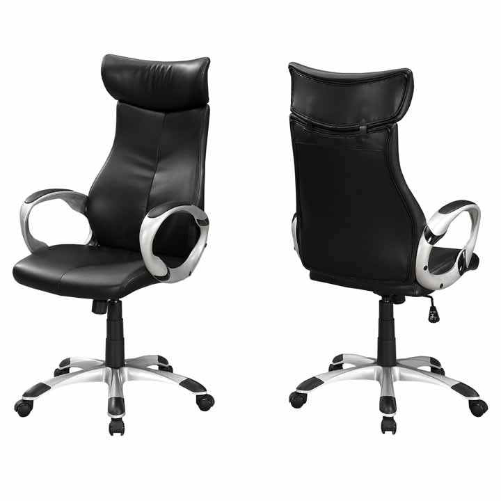 Bring comfort and style together with this modern high back leather-look executive office chair. BIFMA certified for home or commercial use, this elegant black executive chair is supremely cushioned and curved to support your back and head, accented with rounded sleek silver armrests. The thick swivel seat conveniently adjusts to your desired height with a lever, along with a tilt back lock-in mechanism. The sturdy silver metal base with five capped nylon castors, smoothly glides across the floor for easy mobility. This easy to assemble trendy executive office chair gives a rich look to any office or gaming space.