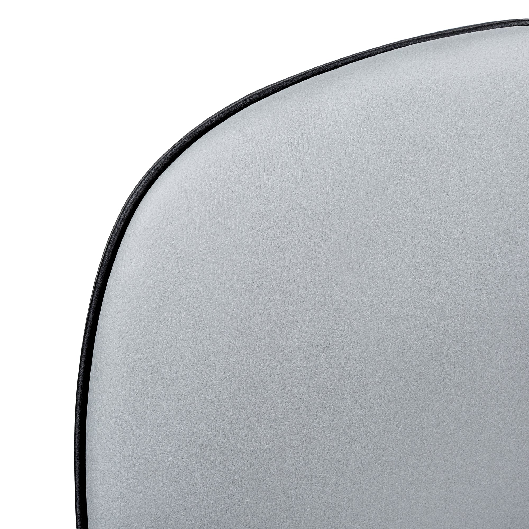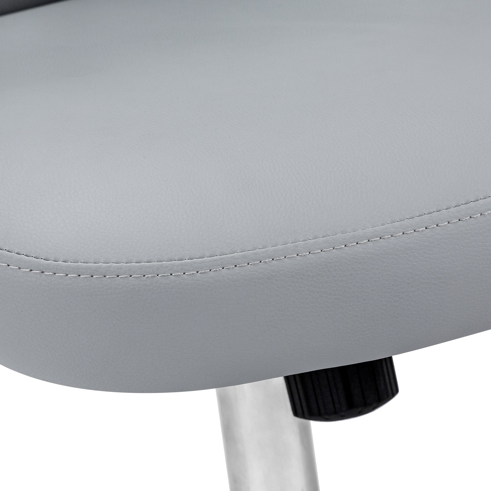 • BIFMA standards, certified for home or commercial use• Cushioned adjustable seat height with tilt back/lock-in free mechanism• Five-star 360 degrees swivel metal base with capped nylon castors for a smooth movement• Padded and fixed armrests in a sleek contemporary design• Upholstered in a chic grey leather-look fabric with a glossy white finish in the back, and accented in black for added style
