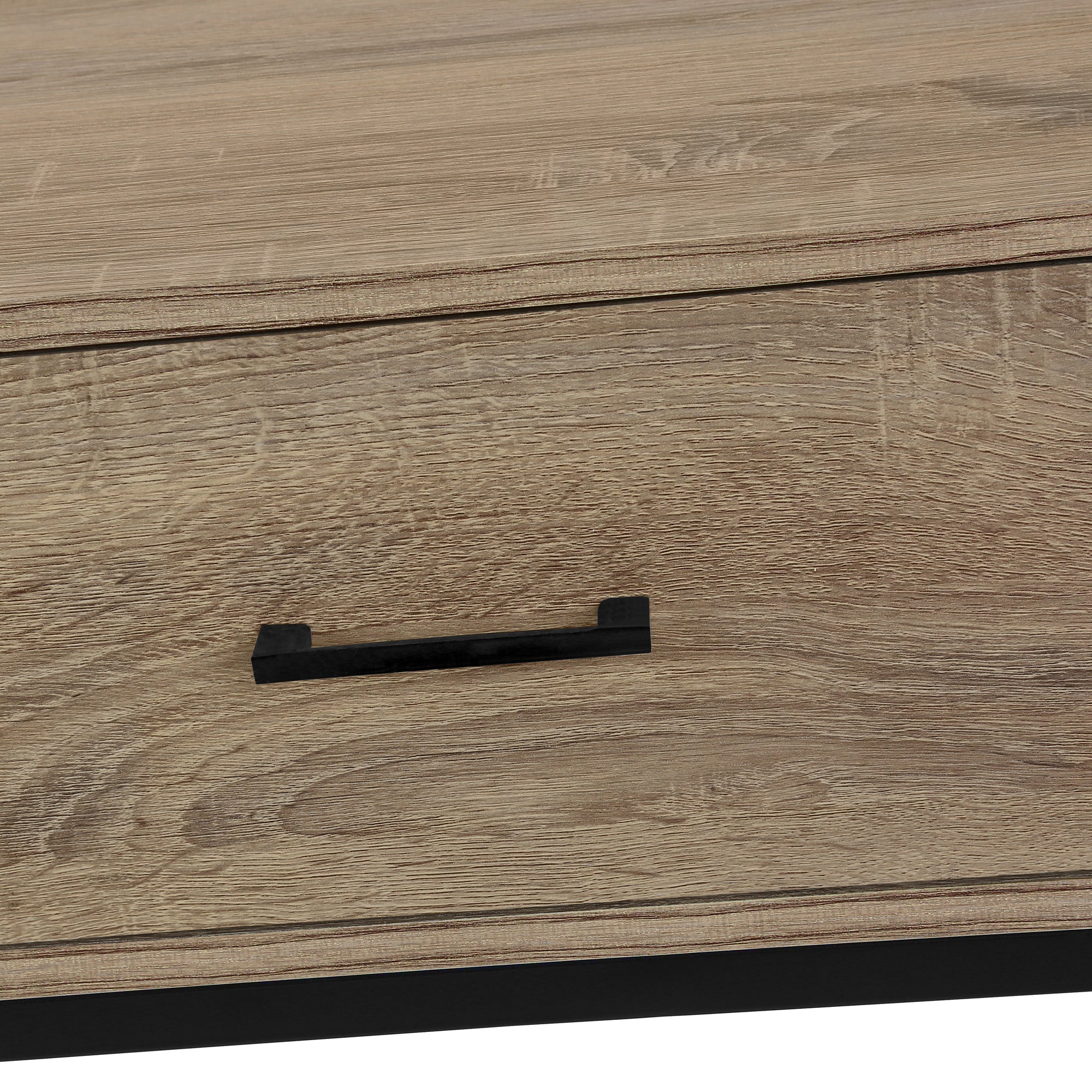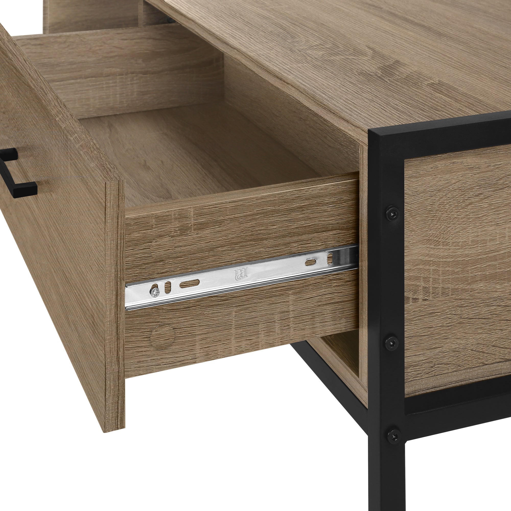 This streamlined TV stand with storage will give your living room or bedroom a leg up on style. Boasting an industrial-inspired design, it features a slender black metal frame with tall legs. The top panel, open shelf, and drawer in a dark taupe wood-look finish offer flexible storage solutions for your entertainment center components. Most TVs can be accommodated on the top panel when centered, while the shelf underneath is open in the back for easy cable management. The drawer can be positioned on the left or right as desired and glides smoothly on metal drawer slides. With its compact design and clean lines, this media console is great for a condo, apartment, or small home.