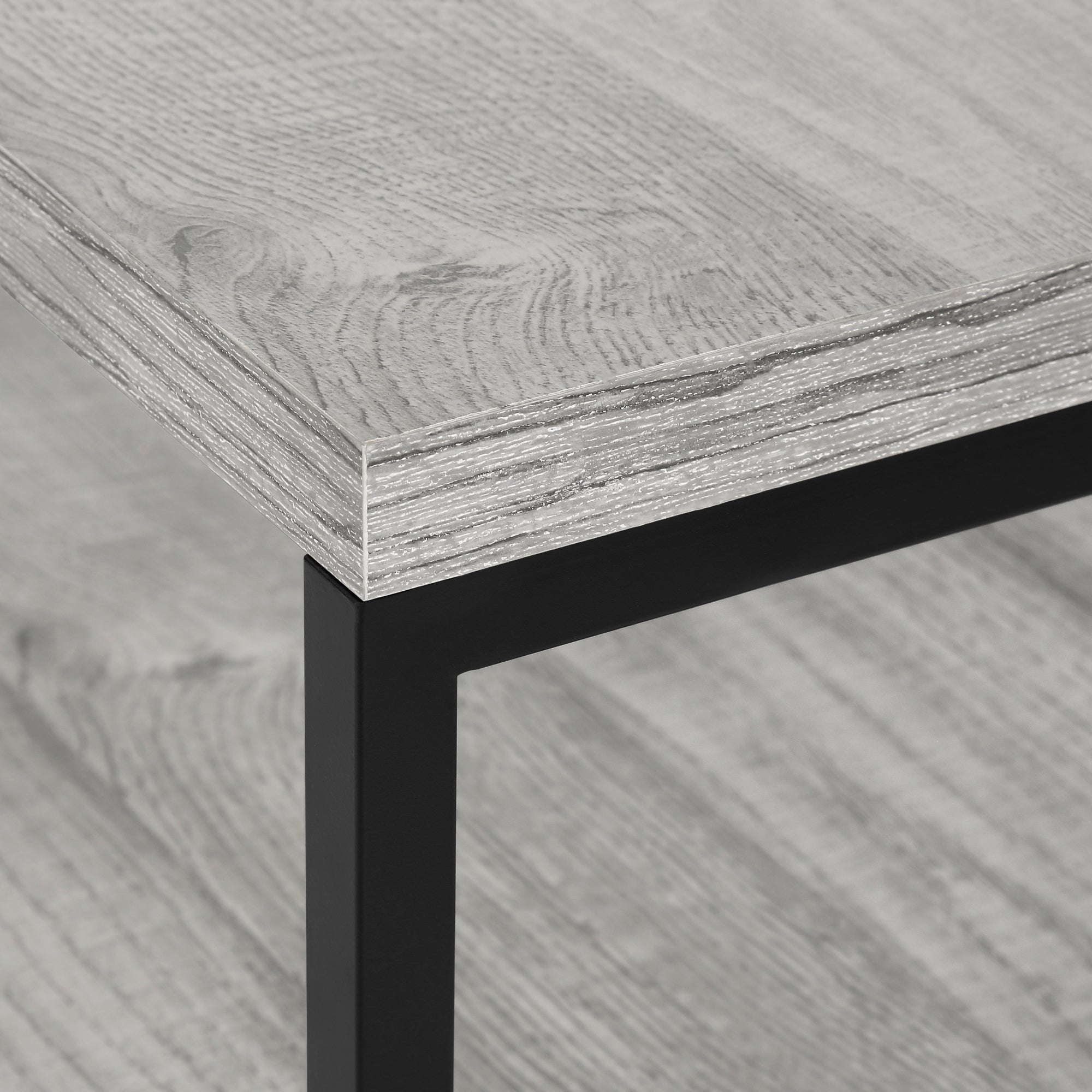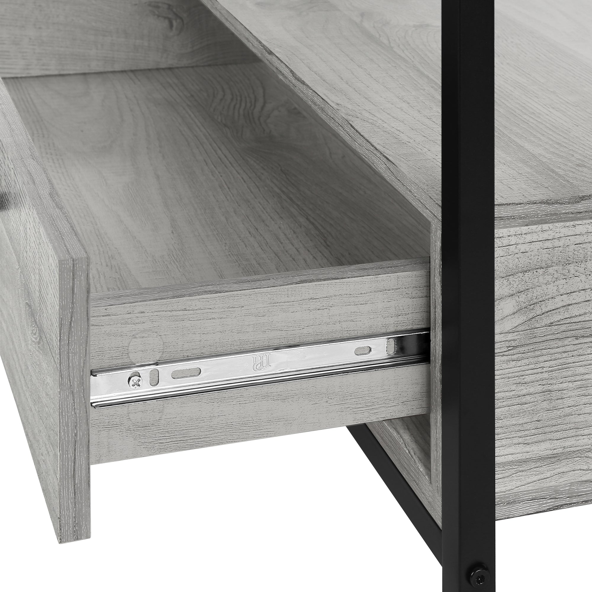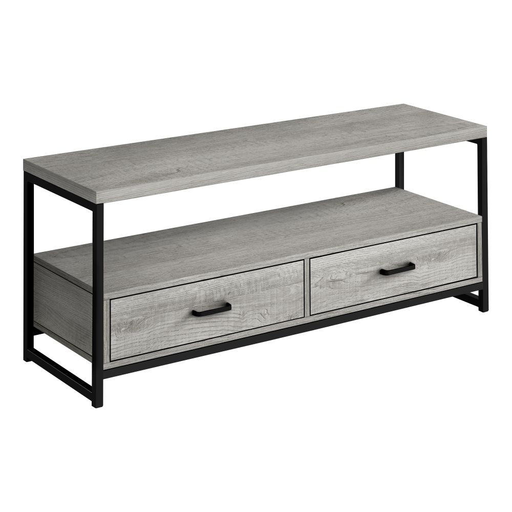 Double up on storage with this TV stand that offers 2 tiers and 2 drawers to neatly organize your electronics and other items. The spacious top shelf with thick-panel construction accommodates most TVs when centered. Below, the open-concept shelf provides ample room for audio-visual components and easy cable management, while the 2 drawers can store remotes, game controllers, or entertainment center accessories. The shelves and drawers in a grey wood-look finish are supported by a sleek black metal frame that gives a modern look. With its space-saving design, this media console is a great choice for a living room or bedroom in an apartment, condo, or small home.
