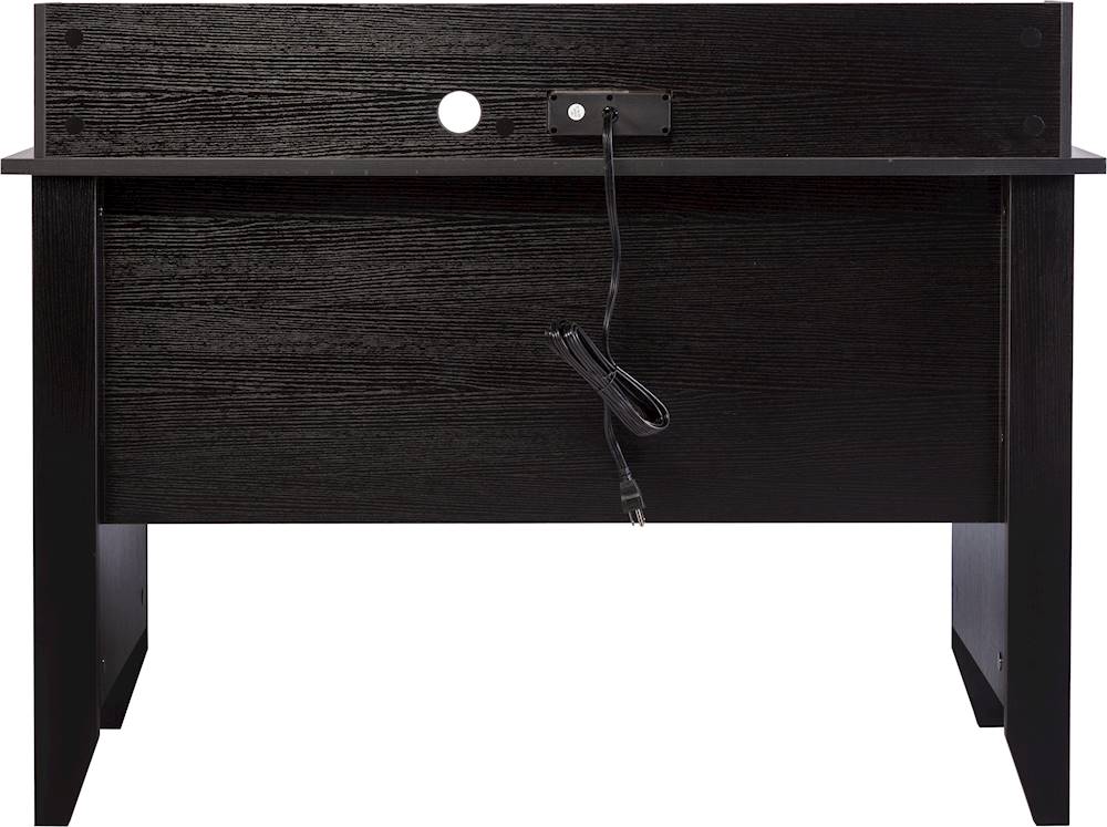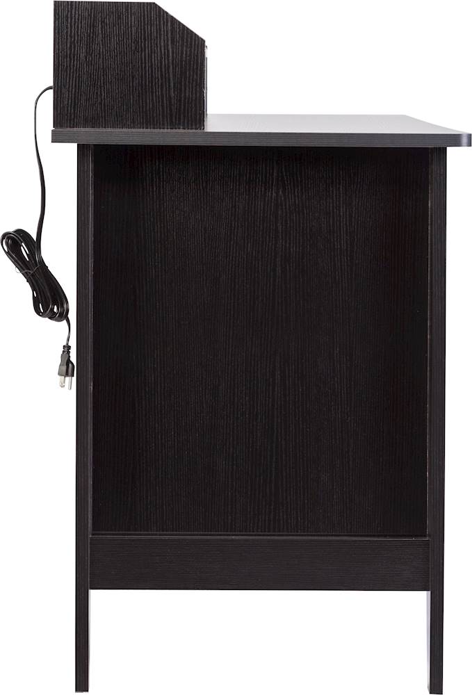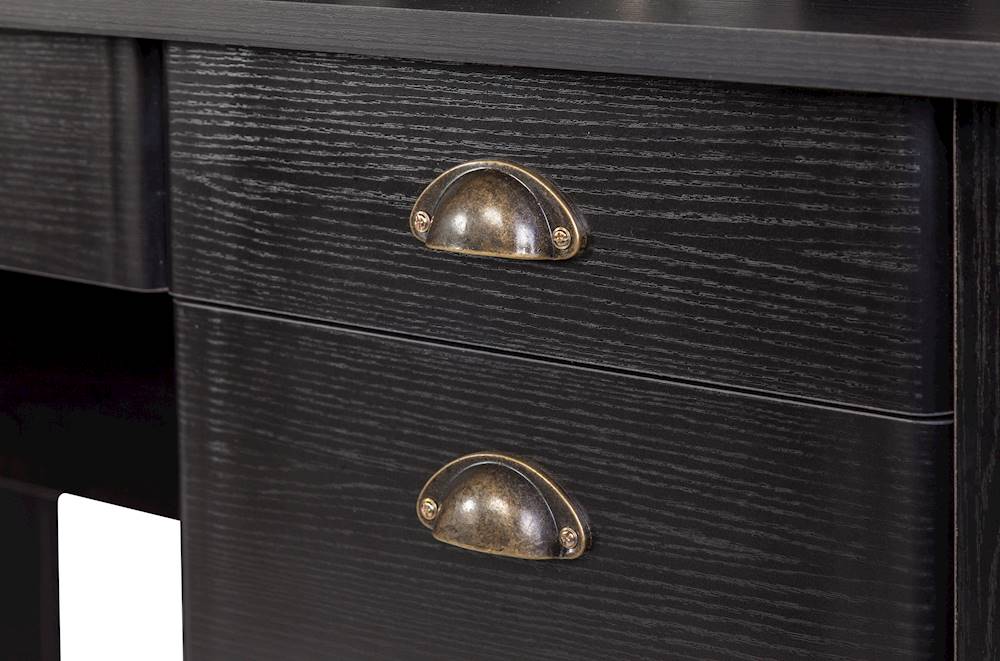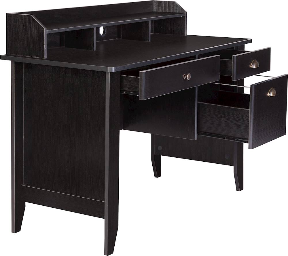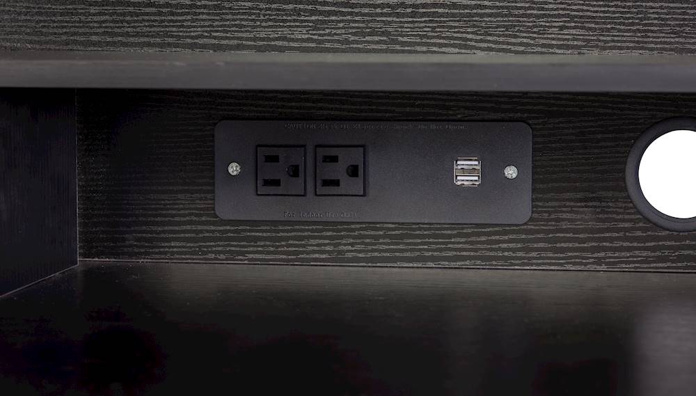 Do paperwork and computer tasks neatly on this 47.25-inch OneSpace Eleanor executive desk. The large hutch has two outlets, dual USB ports and a cable hole to support a workstation, while three different drawers keep files and supplies organized. This OneSpace Eleanor executive desk is constructed with MDF material for durability, and the black melamine finish provides a sophisticated appeal.