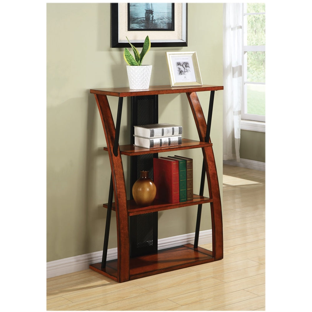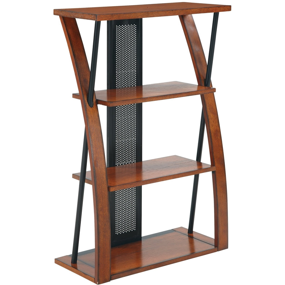 Furnish any modern space with this four-tier OSP Designs Aurora bookcase. The arched and intersecting leg design adds stylish character to a transitional interior, and its perforated black metal panel provides extra support and conceals AV component cables. This 30-inch OSP Designs Aurora bookcase has a medium oak finish for a classic, natural look.