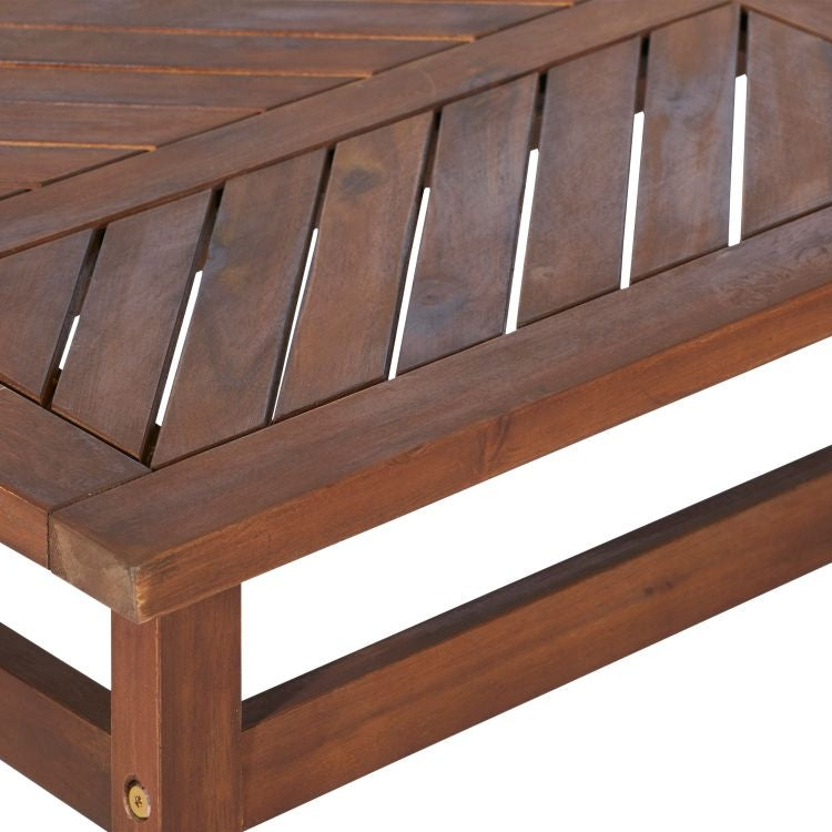 With an acacia wood construction, this patio coffee table is perfect for any outdoor space, whether in your backyard or on your deck, patio, or porch. In a stained finish featuring a chevron designed table top for a modern and transitional style. Pair next to your outdoor chairs or loveseat to enjoy coffee, tea, or hot cocoa with a friend on the weekends. You'll love the simple aesthetic this coffee table will add to your outdoor living space.