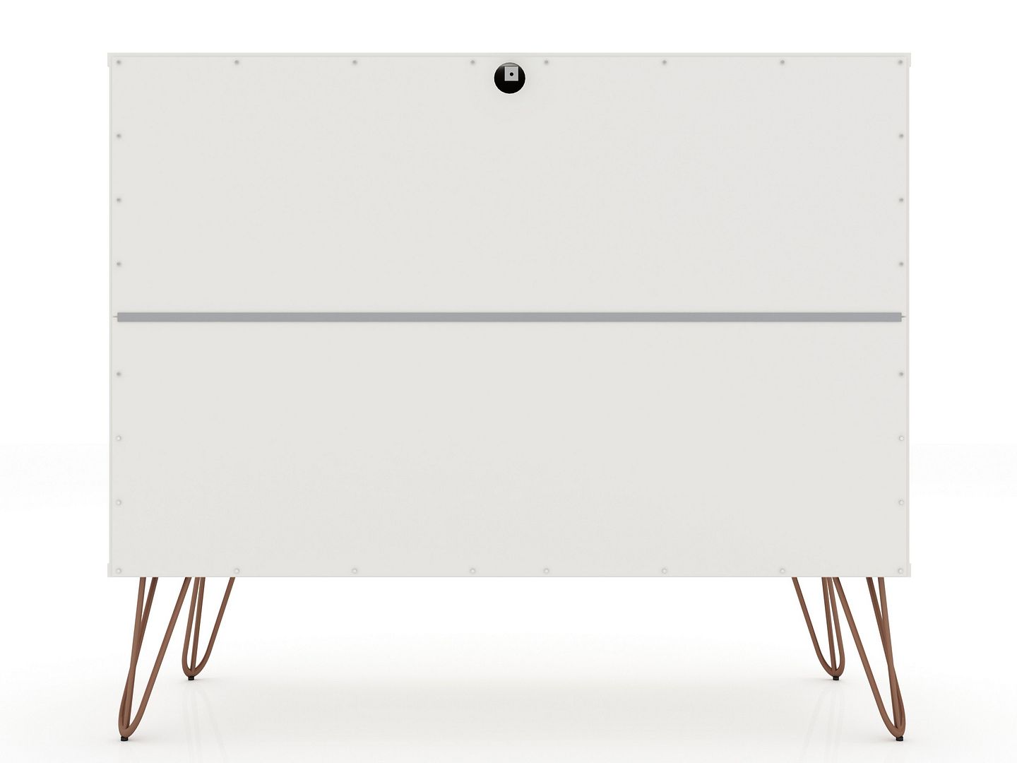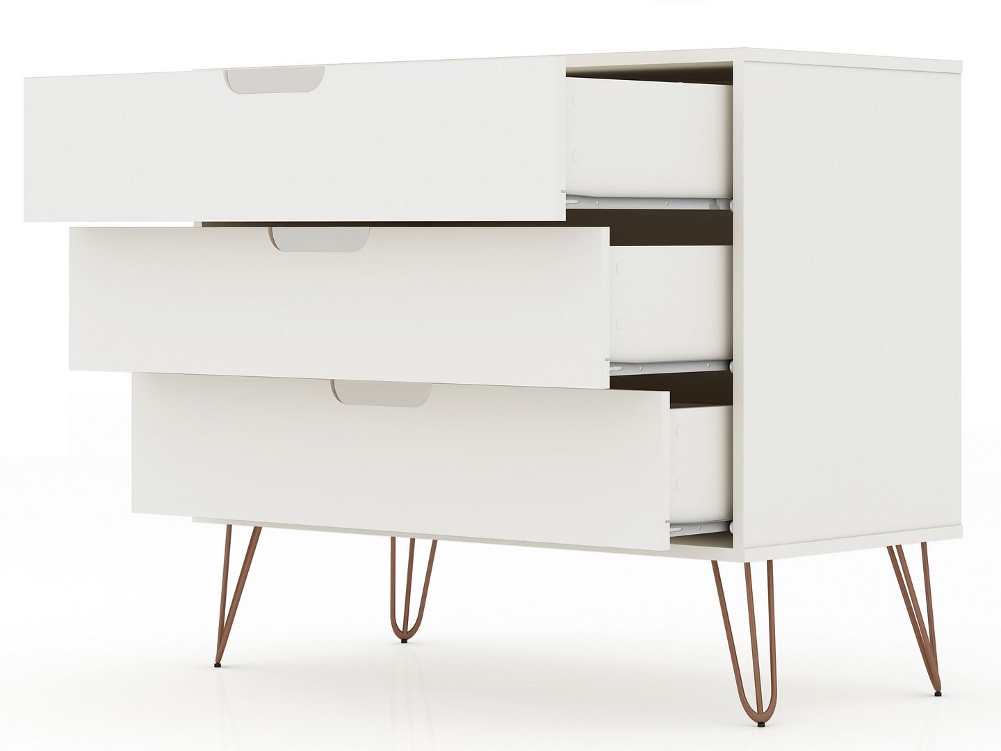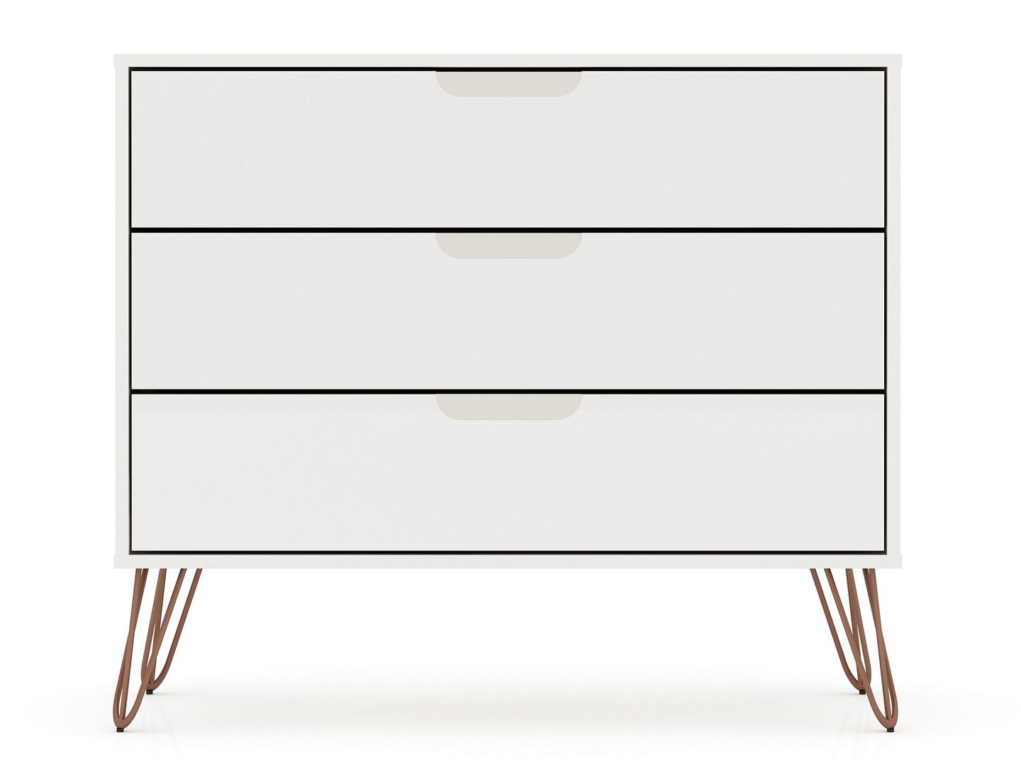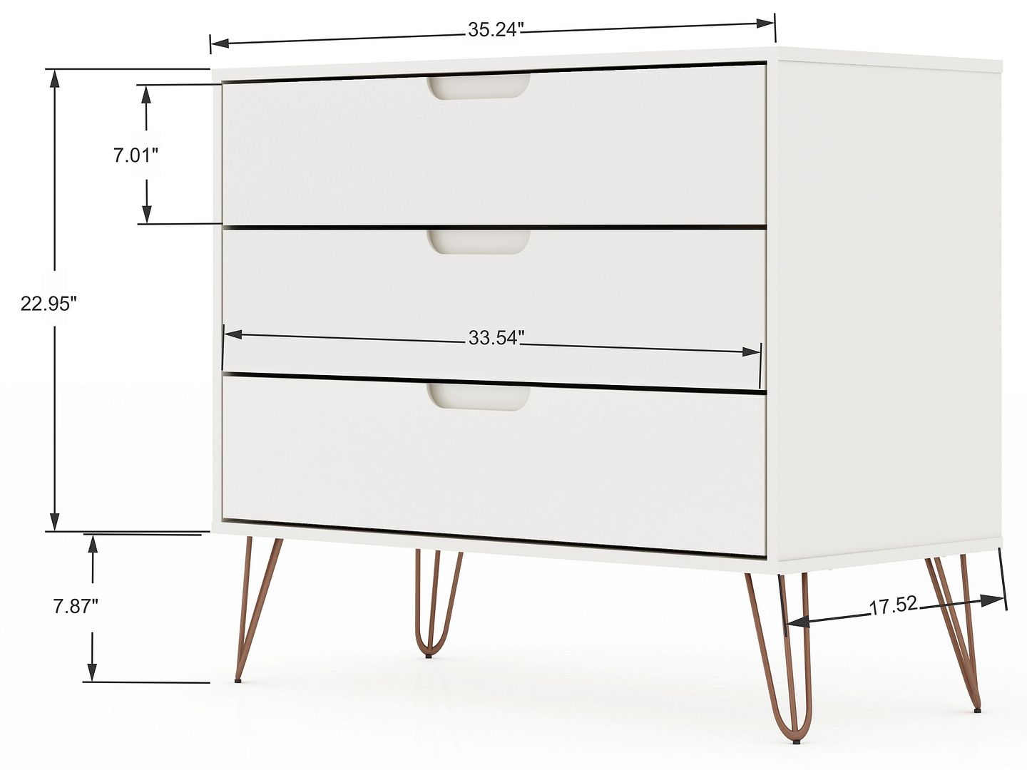 The Rockefeller dresser is the perfect accompaniment to any bedroom space, with ample storage and minimalistic Mid-century modern style. Cutout handles keep the piece feeling fresh with three drawers made easy for stowing away clothing, personal items, and beyond. A display top allows for sharing favorite framed family photos, travel trinkets, perfume trays, or a decorative lamp. Set it under a mirror or painting to complete your space with this instant bedroom focal point. 35.24"L x 17.52"W x 28.86"H
