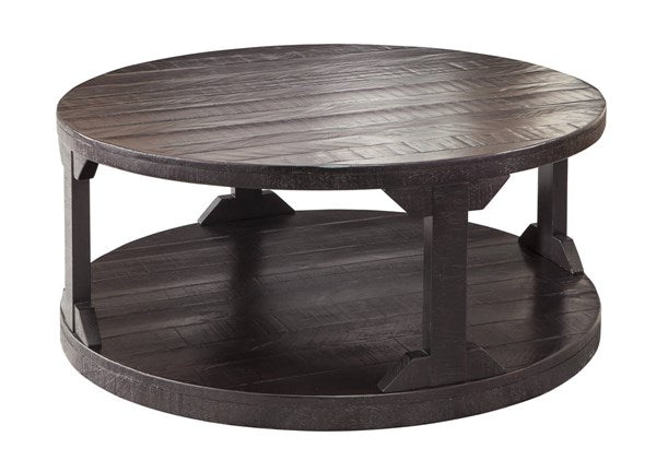 If you want to add rustic flair to your seating arrangement, roll with the casual style and flexibility of the Rogness round coffee table. Its heavily distressed finish in dark brown takes you back to a simpler time. The lower shelf provides extra storage and casters make it easily mobile, ideal for flexibility.