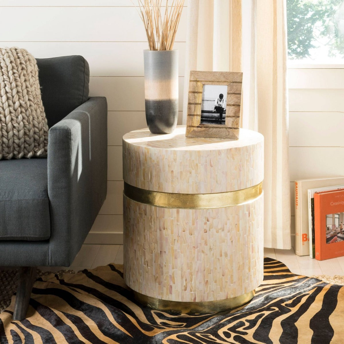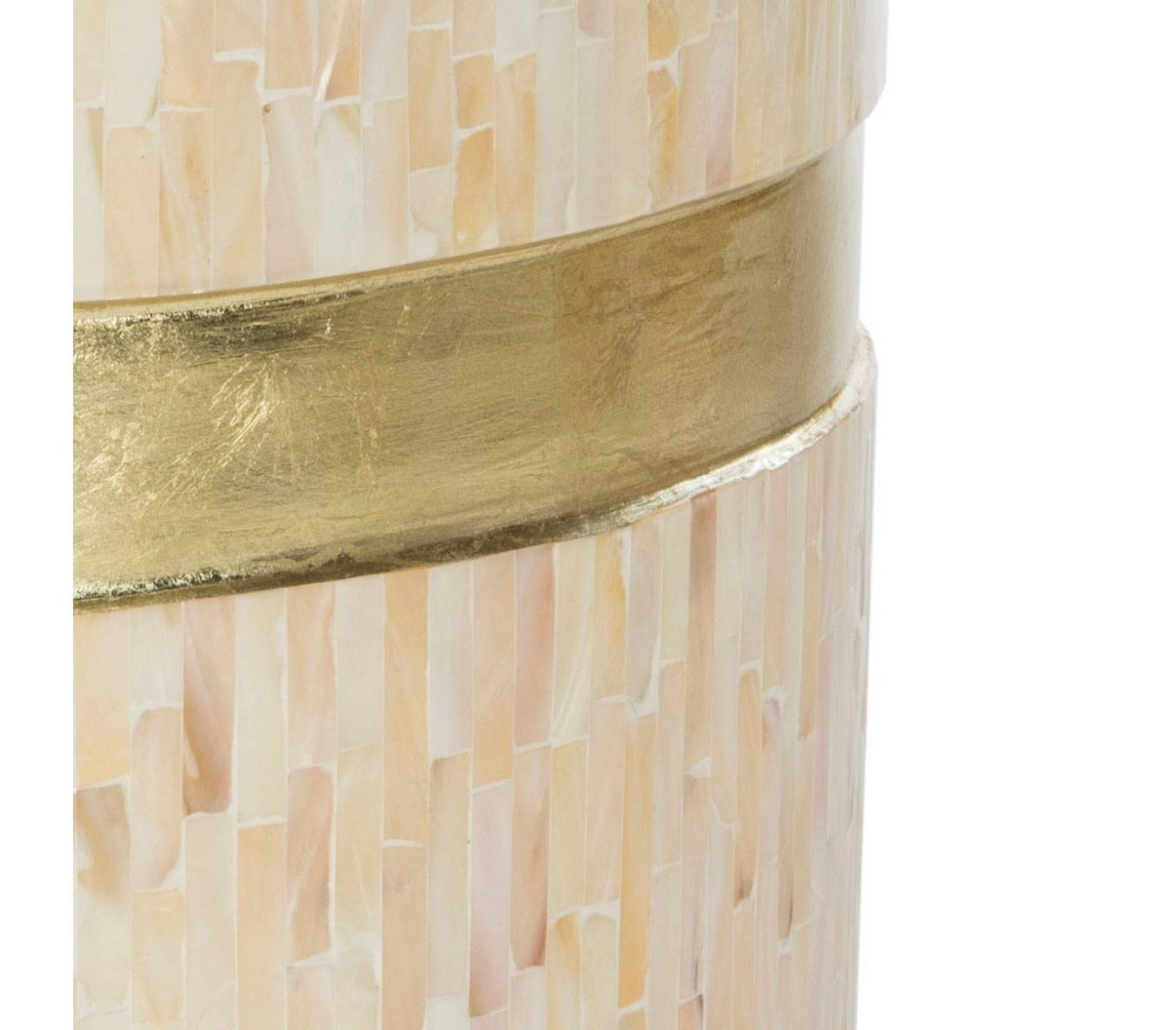 The jewel in any living room, this contemporary mosaic round side table is a modern indulgence. Crafted with faux mother of pearl and lacquer, its pink champagne and gold finishes create a sophisticated artistic focal point. Ideal for using in pairs.