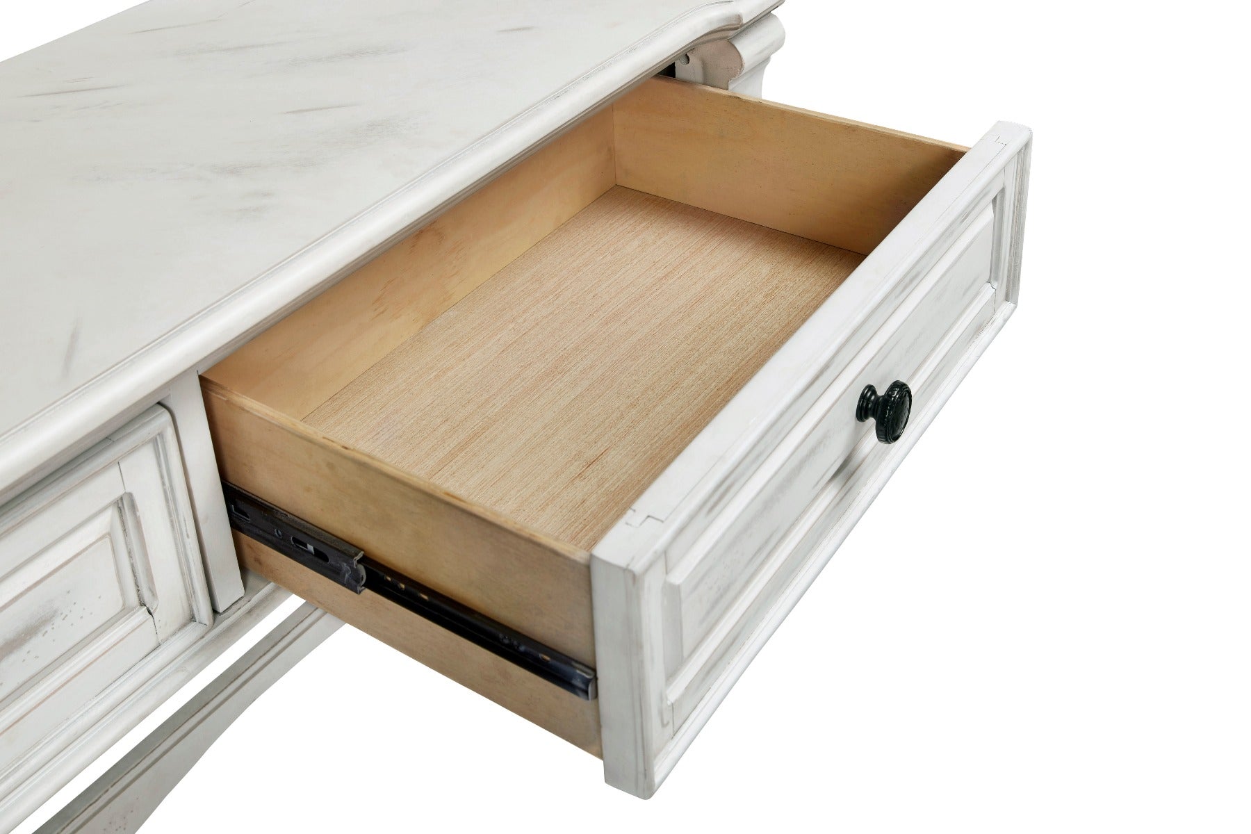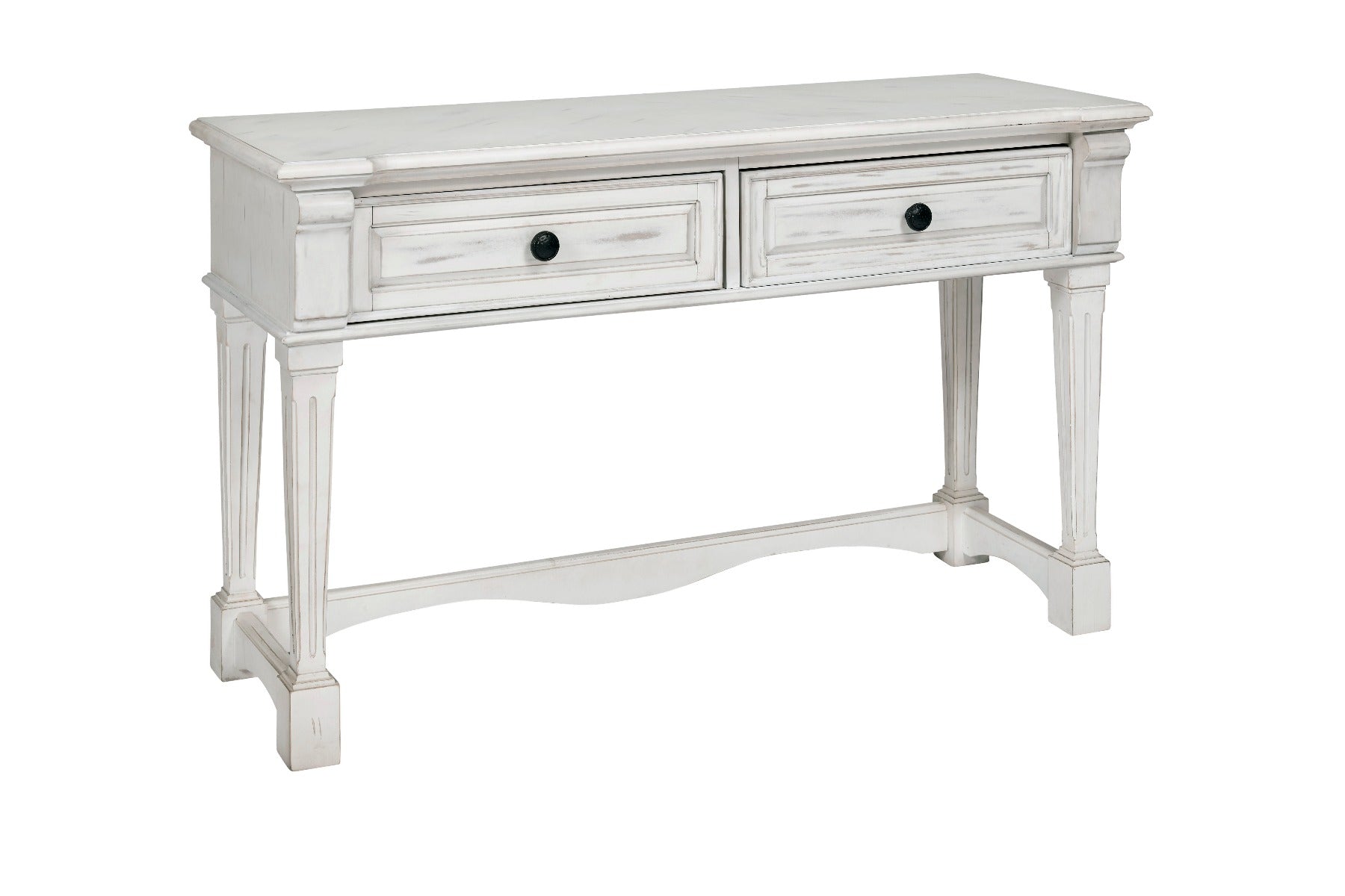 A farmhouse favorite. Casual and comfortable tables that will soften any room with this clean, crisp "Chalk White" finish. This sofa/console table is a classic style with two drawers, full extension metal guides, wood molding base designs, beautiful distressing, and gorgeous textured antique bronze hardware.