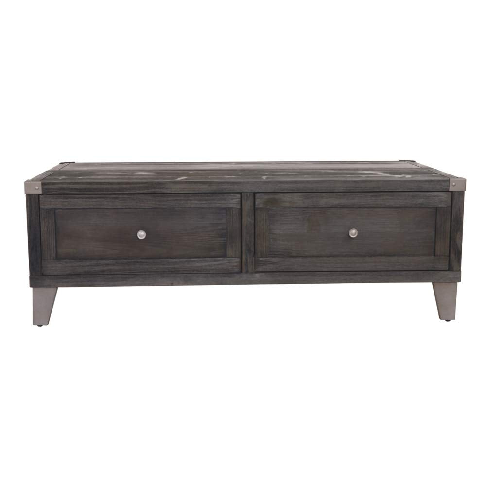 Made with Pine solids and veneers and finished in a dark grayish brown weather washed color with wire brushing texture. Cocktail table features a half lift top surface, fully finished drawers with removable storage trays.
