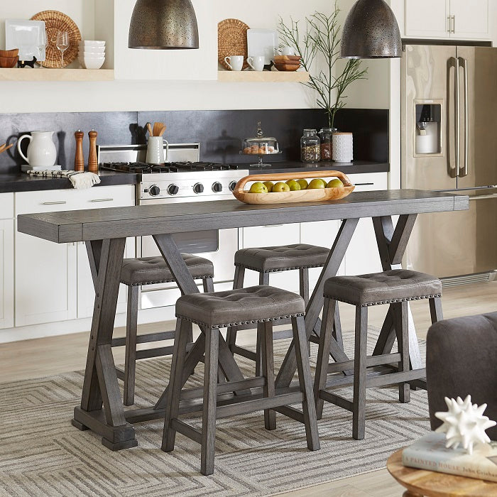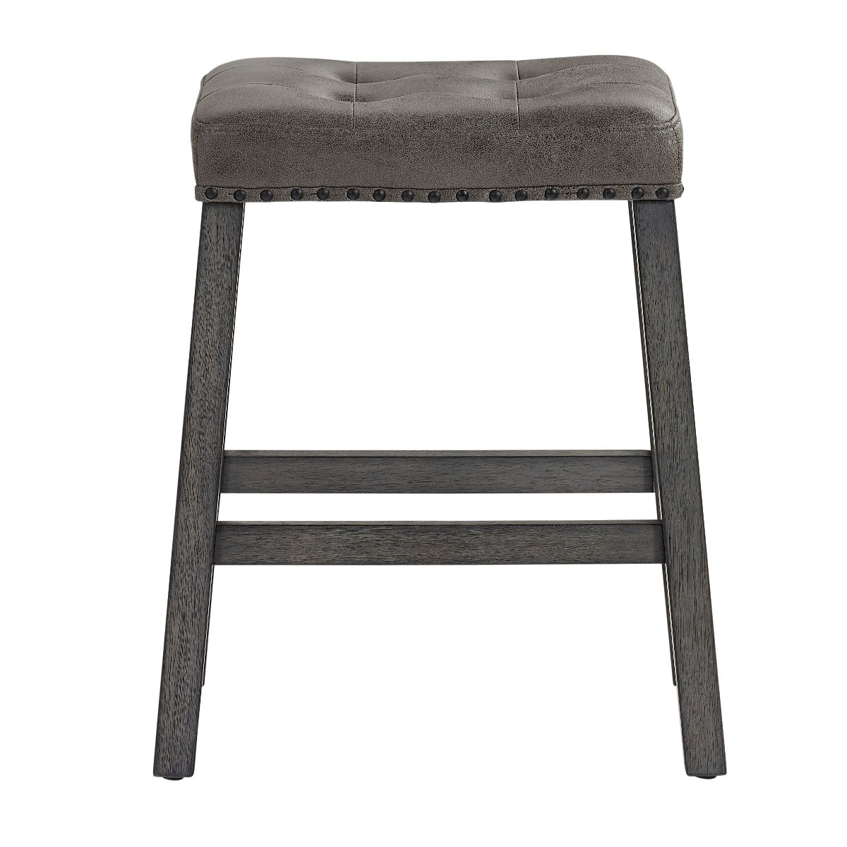 These counter stools are a great transitional design finished in a handsome Harbor Gray color highlighting the gorgeous wood grain. These stools are upholstered in a distressed gray PU leather fabric with dark bronze/black nail head trim and have footrests for add comfort.