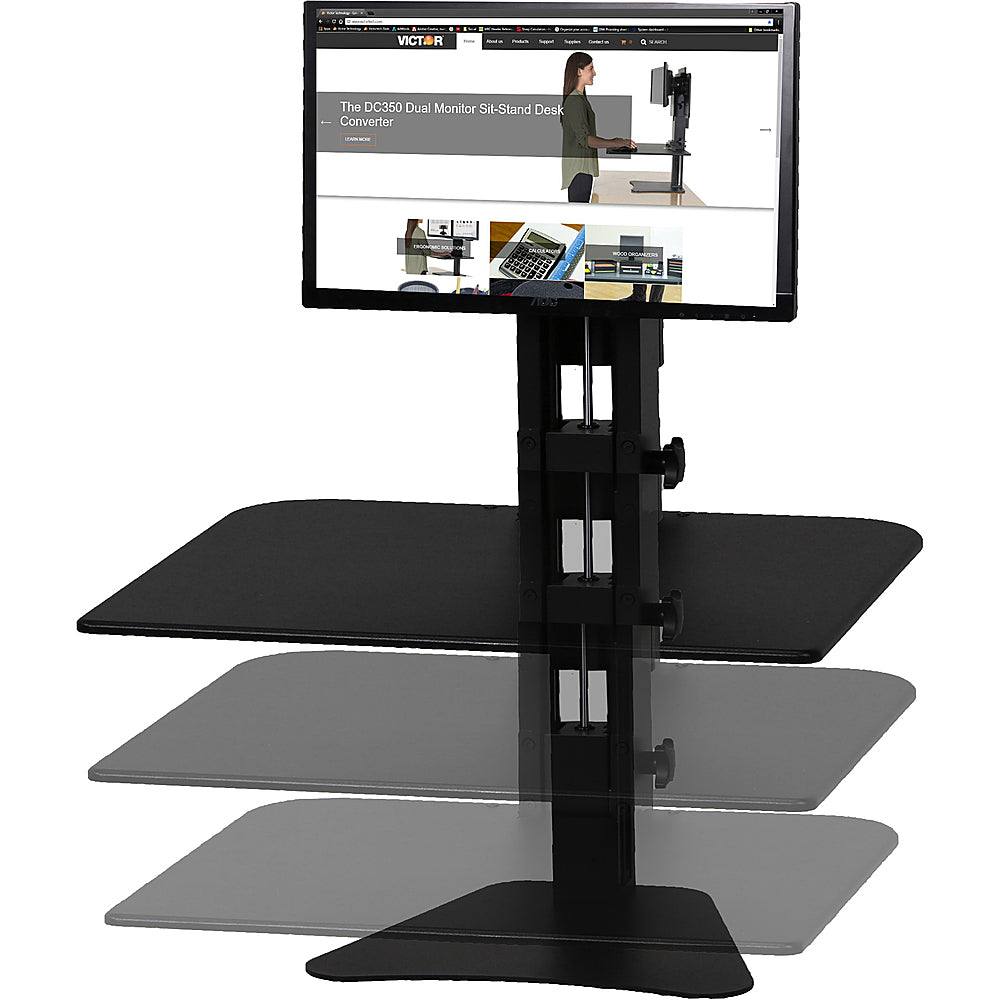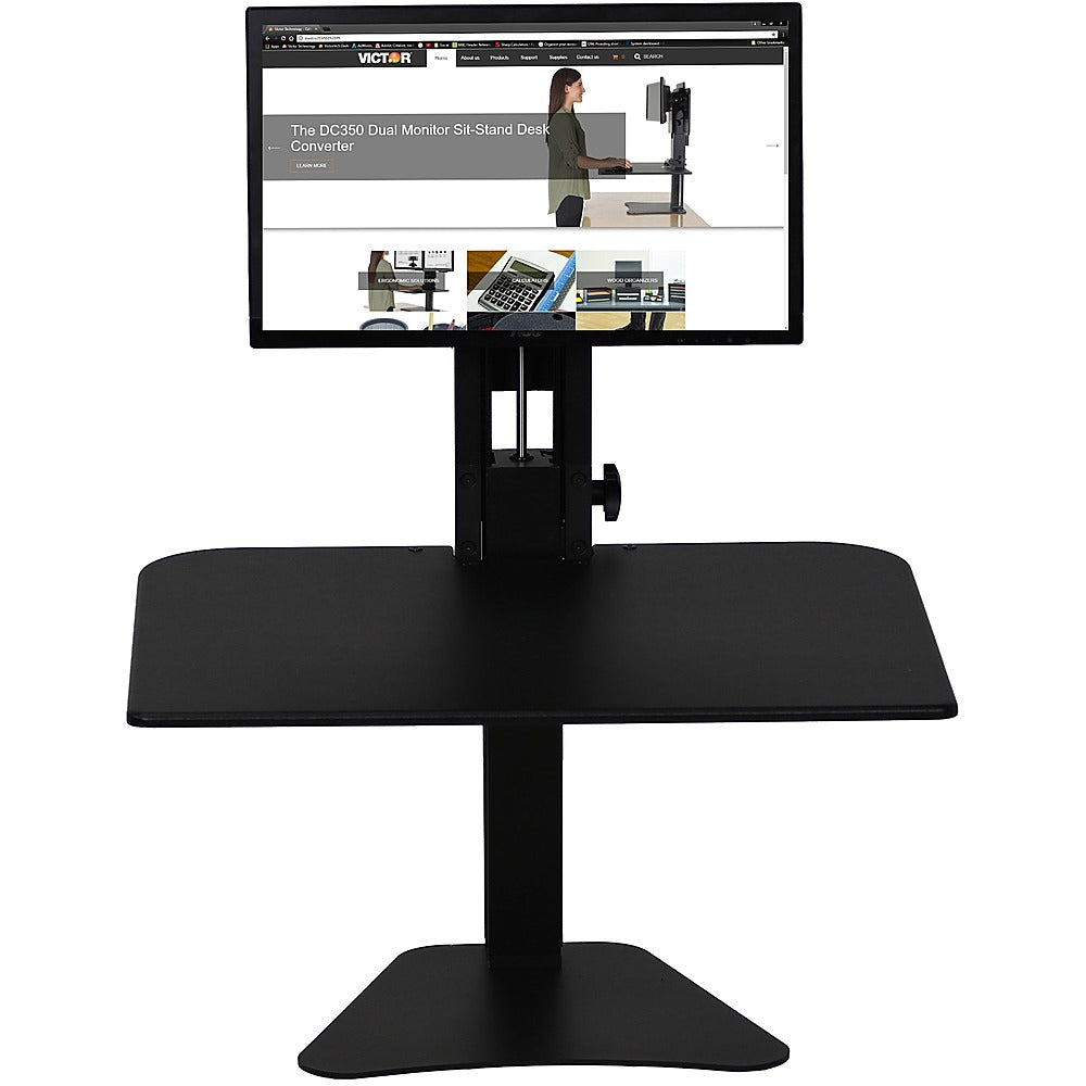 Stay more comfortable during long workdays with this Victor standing desk. It attaches to most standard sit-down desks for convenience, and it has a large work surface that easily holds a mouse, keyboard and other work gear. This Victor standing desk adjusts height with the simple twist of a knob for ease of use.
