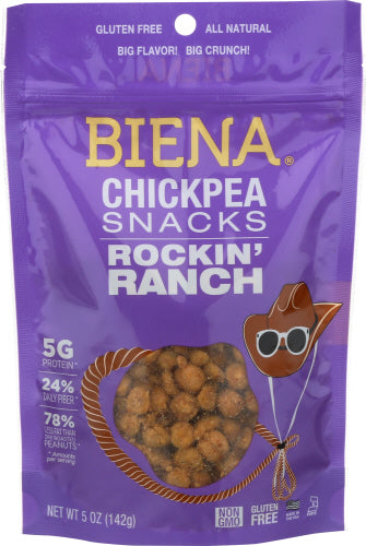 The Biena Rockin Ranch Chickpea Snack is a tasty protein snacking option for kids and adults alike. This crunchy chickpea snack contains 78% less fat than dry roasted peanuts, making it a great option for those allergic to peanuts. The Biena chickpea snack bulk pack with 8 packs is ideal for retail stores, cafeterias and school and office pantries.