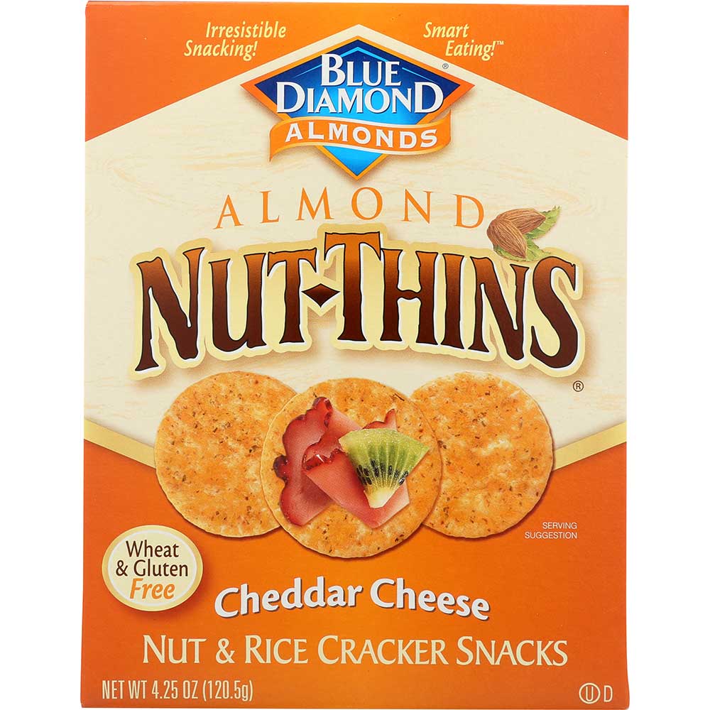 Blue diamond nut-thins, cheddar cheese are a delicious snack, either on their own or with other treats. Made with natural ingredients, blue diamond nut-thins are free of unnatural and unnecessary additives, leaving you with pure, natural and simple taste. This product is gluten-free and Kosher. Each box of blue diamond nut-thins, cheddar cheese weighs 4.25 oz. With four servings per box and 130 calories per serving. See nutrition facts panel for allergens.