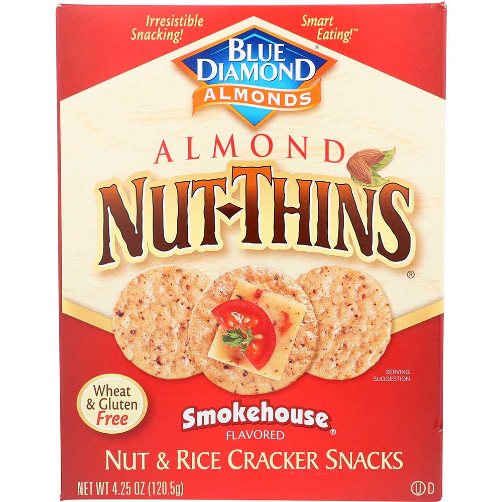 Blue diamond nut-thins, smokehouse are a delicious snack, either on their own or with other treats. Made with natural ingredients, blue diamond nut-thins are free of unnatural and unnecessary additives, leaving you with pure, natural and simple taste. This product is gluten-free and Kosher. Each box of blue diamond nut-thins, smokehouse weighs 4.25 oz. With four servings per box and 130 calories per serving. See nutrition facts panel for allergens.