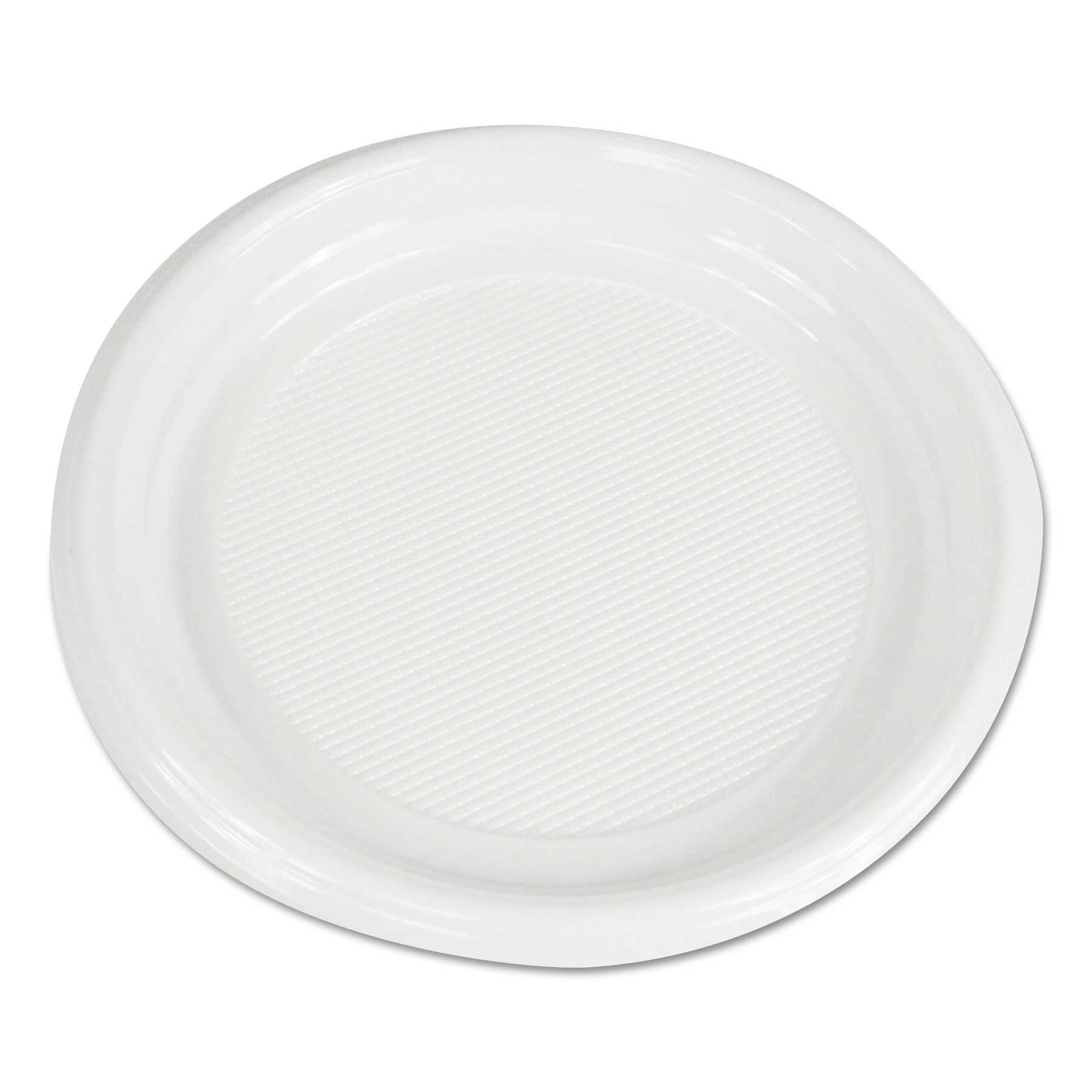 Convenient and practical plastic dinnerware is durable, non-absorbent, leak-proof and soak-proof. It's designed with deep proportions to avoid spillage so your dinner stays safe. Dinnerware Type: Plate; Material(s): Plastic; Shape: Round; Diameter: 9 .