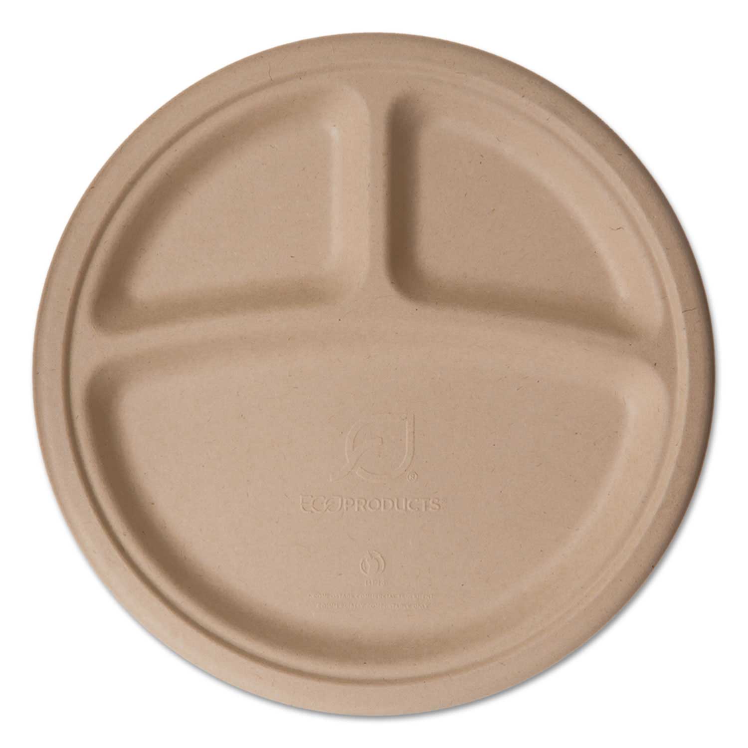 Unique biopulping process ensures these heavyweight champs are sturdy and durable. Made with wheat straw, a rapidly renewable resource. Made from 100 percent renewable and reclaimed resources. Grease and cut resistant. Freezer safe. 3-Compartment Plate. Dinnerware Type: Compartment Plate; Material(s): Wheat Straw; Shape: Round; Diameter: 10 .