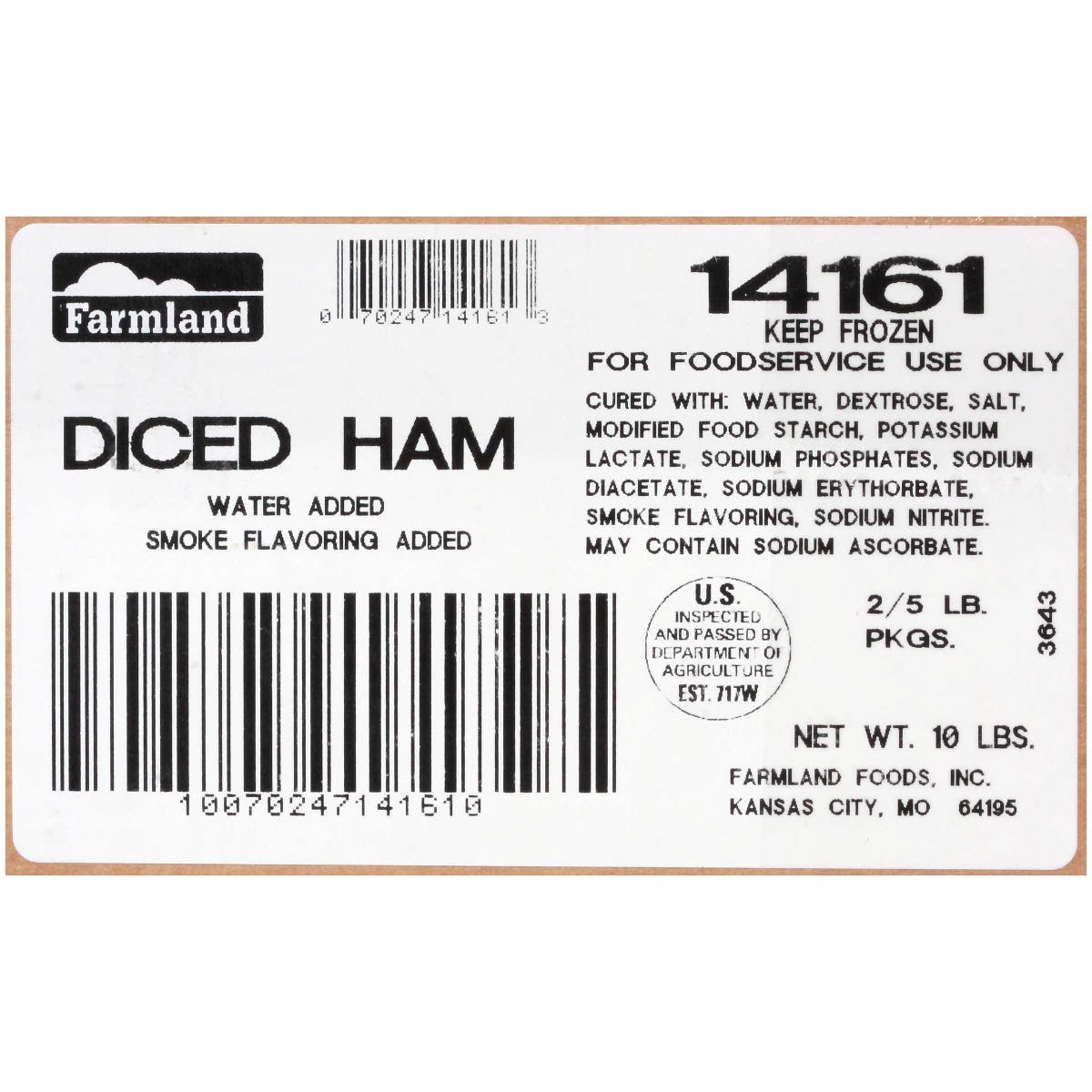 The Farmland Smoked Diced Ham can be used as a topping for pizzas, salads, and various meat dishes. Prepared from premium pork meat, it is infused with real hickory smoke. This smoked ham has water added and has a rich smokehouse flavor. The Farmland smoked ham bulk pack will be great for pizzerias, diners, and bistros.