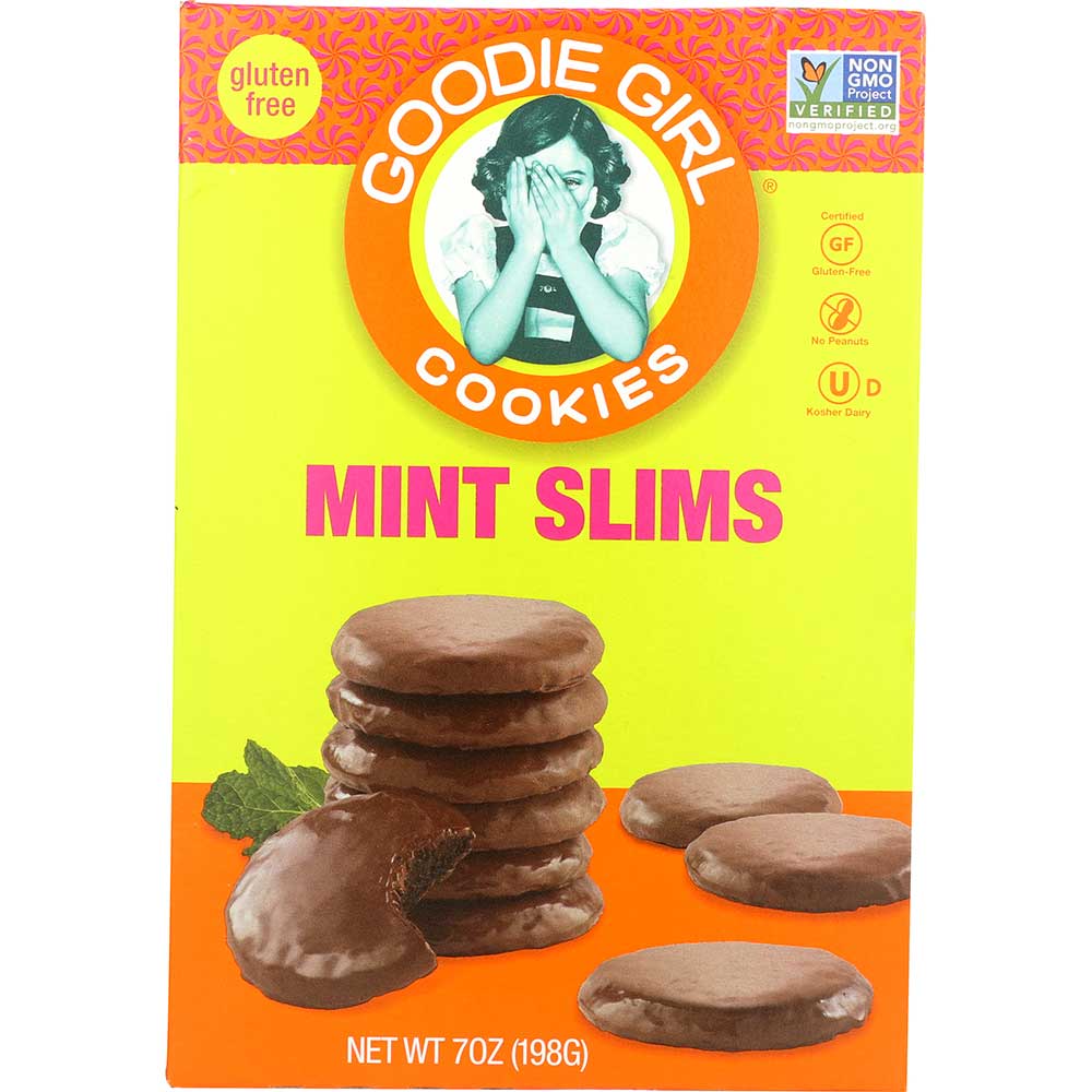 Goodie girl cookies, mint slims are chocolate coated, mint wafer cookie treats. For adults and kids alike, these crunchy cookies are gluten-free, Kosher and non-gmo. Go ahead and snack on these insanely delicious, good-for-you goodies. Each box of goodie girl cookies, mint slims contains 7 oz. Of product.